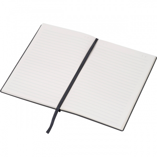 Блокнот формата А5 с мягкой мягкой обложкой из полиуретана, закладкой и 192 страницами в линейку из переработанной бумаги. Ваш логотип напечатан на обложке под плетёной областью.