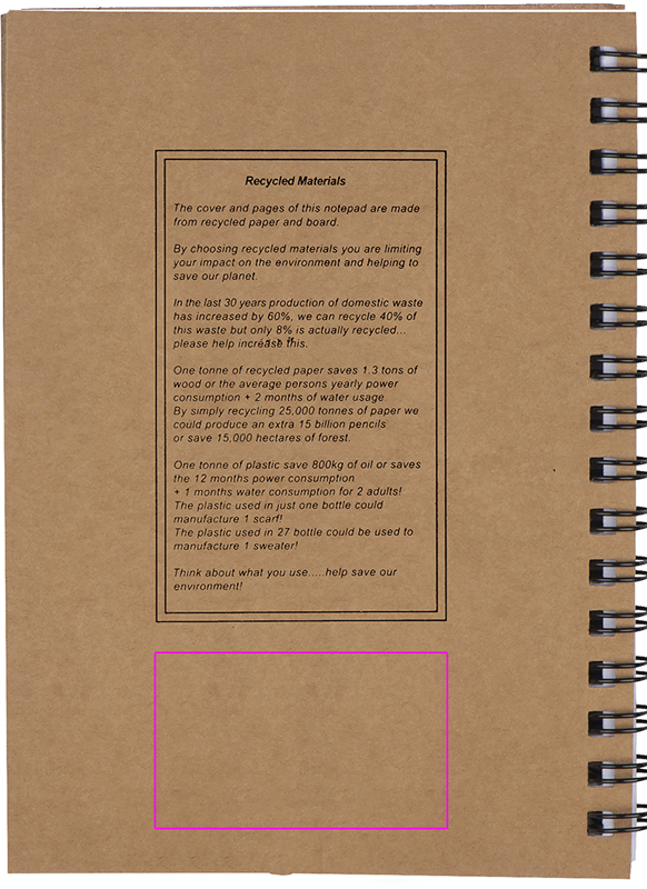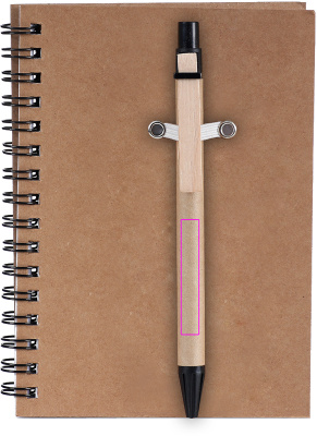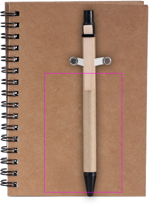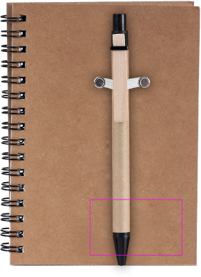 Блокнот из переработанного картона со 120 страницами из переработанной бумаги и шариковой ручкой с синими чернилами. Мы напечатаем ваш логотип на обложке.