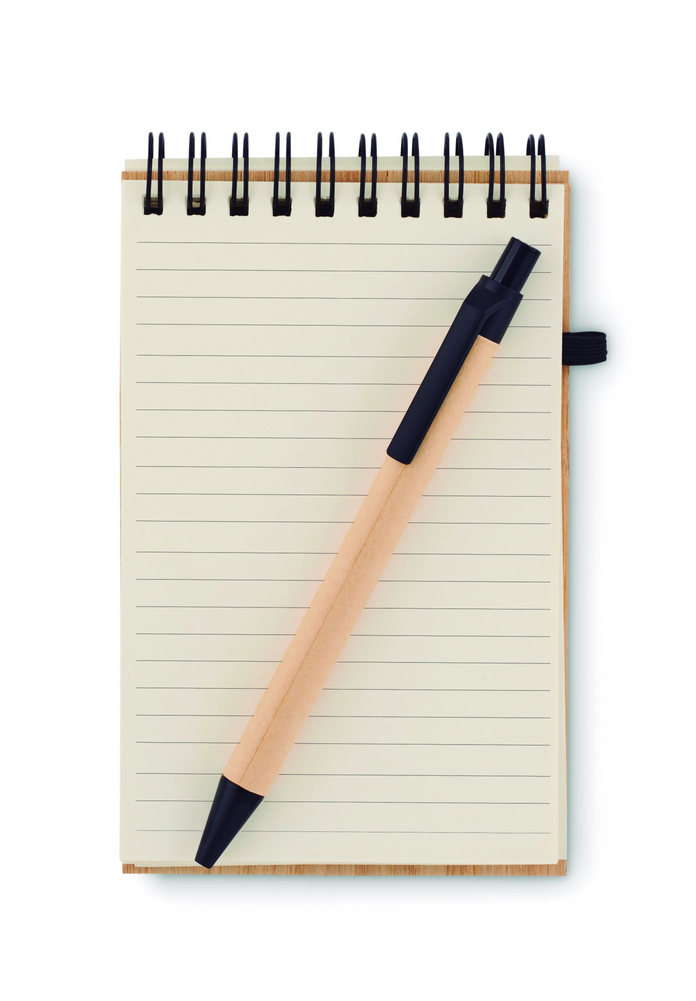 Блокнот A6 в бамбуковой обложке с 70 листами линованной переработанной бумаги. В комплект входит соответствующая шариковая ручка из переработанной бумаги с наконечником из полимерного материала и клипом. Синие чернила.
