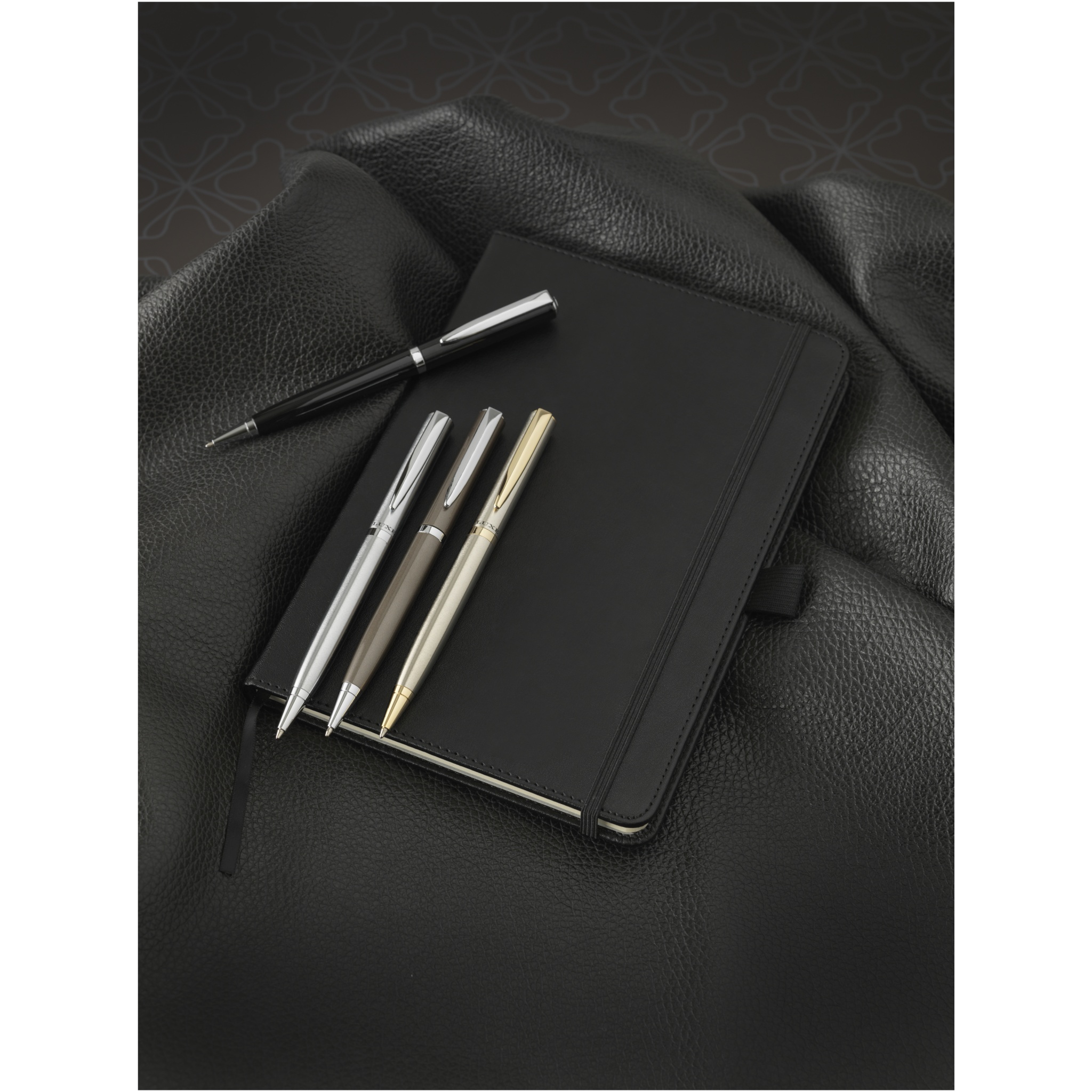Эксклюзивная легкая шариковая ручка с золотой матовой шлифованной поверхностью и золотыми вставками и серебряной матовой шлифованной поверхностью и хромированными вставками. В набор входит запасной черный стержень премиум-класса. Предлагается в подарочной коробке LUXE (16,5 x 4,5 x 2,8 см).