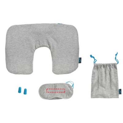 Удобный дорожный набор включает надувную подушку с ярко-синей молнией, маску для глаз с ярко-синей резинкой и ярко-синие беруши в мягком чехле с ярко-синей кулиской.
