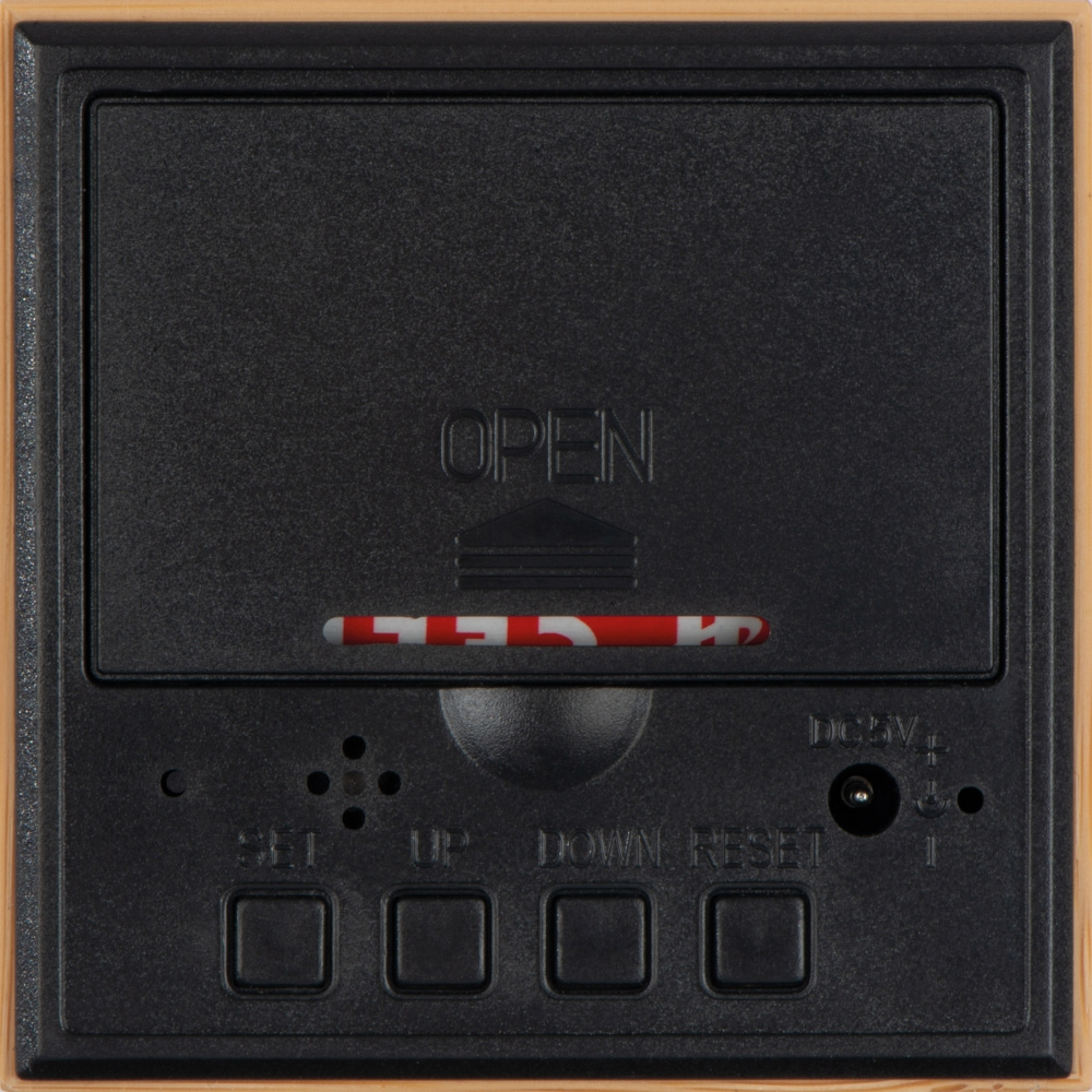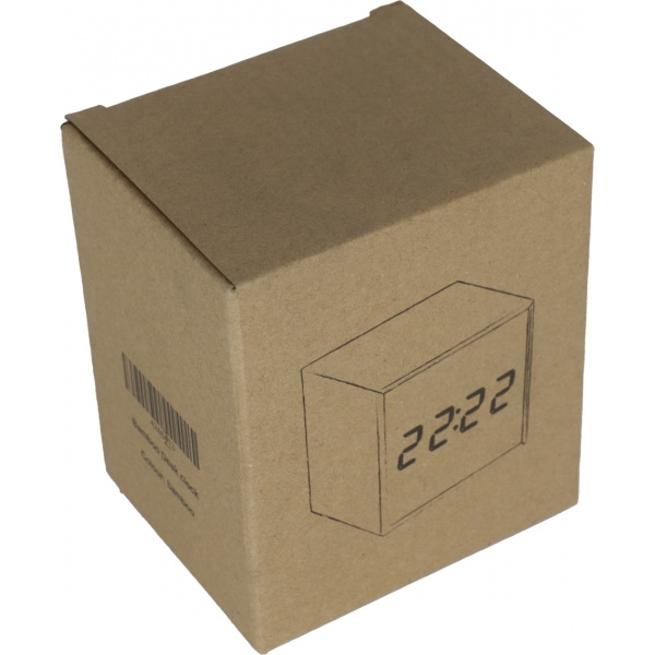 Элегантные настольные часы с деревянным покрытием, черным дисплеем и синими светодиодными буквами, показывающими время, дату и температуру по очереди. Ваш логотип будет выгравирован на верхней части.