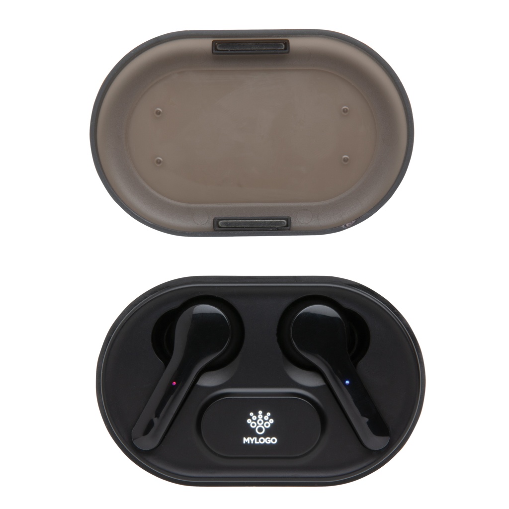 Полная свобода при прослушивании музыки с мобильного устройства. Эти наушники TWS поставляются в беспроводном зарядном футляре емкостью 300 мАч с дополнительной возможностью добавления логотипа, который будет светиться во время зарядки футляра. Наушники заряжаются за 1,5 часа и работают до 3 часов. BT 5.0 для автоматического сопряжения с мобильным устройством и сопряжения наушников друг с другом. Рабочее расстояние до 10 метров. В комплект входит кабель micro USB TPE без ПВХ для подзарядки зарядного футляра. С функцией ответа на звонки. В комплект входят ушные вкладыши 3 размеров, подходящие всем.