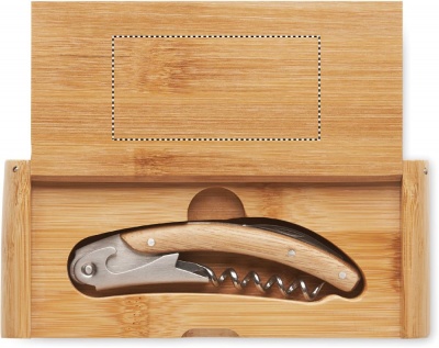 Оригинальный нож официанта из нержавеющей стали с двойной открывалкой и штопором с бамбуковым покрытием. Поставляется в бамбуковой подарочной коробке.