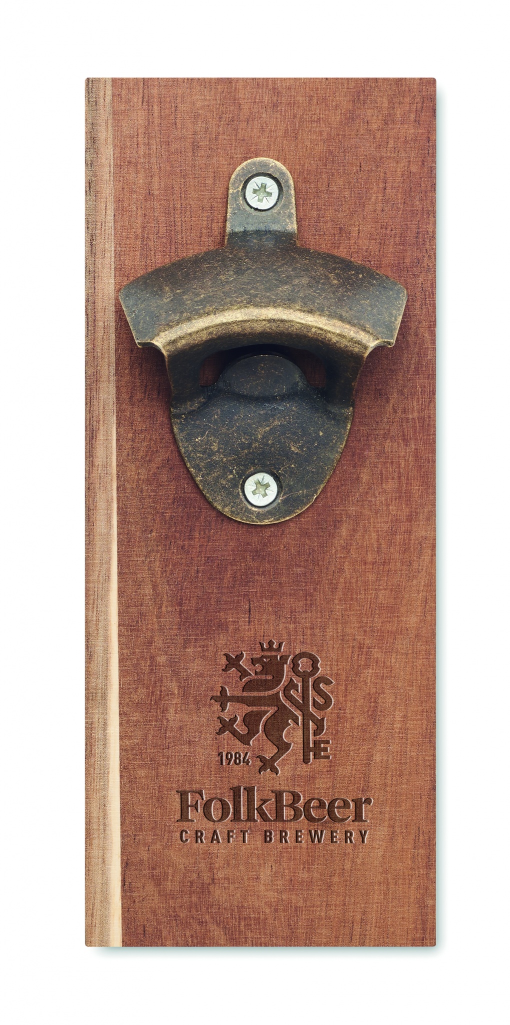 Открывалка для бутылок из дерева акации и железа. Подвешивается на стену при помощи прикрепленного мощного магнита.
