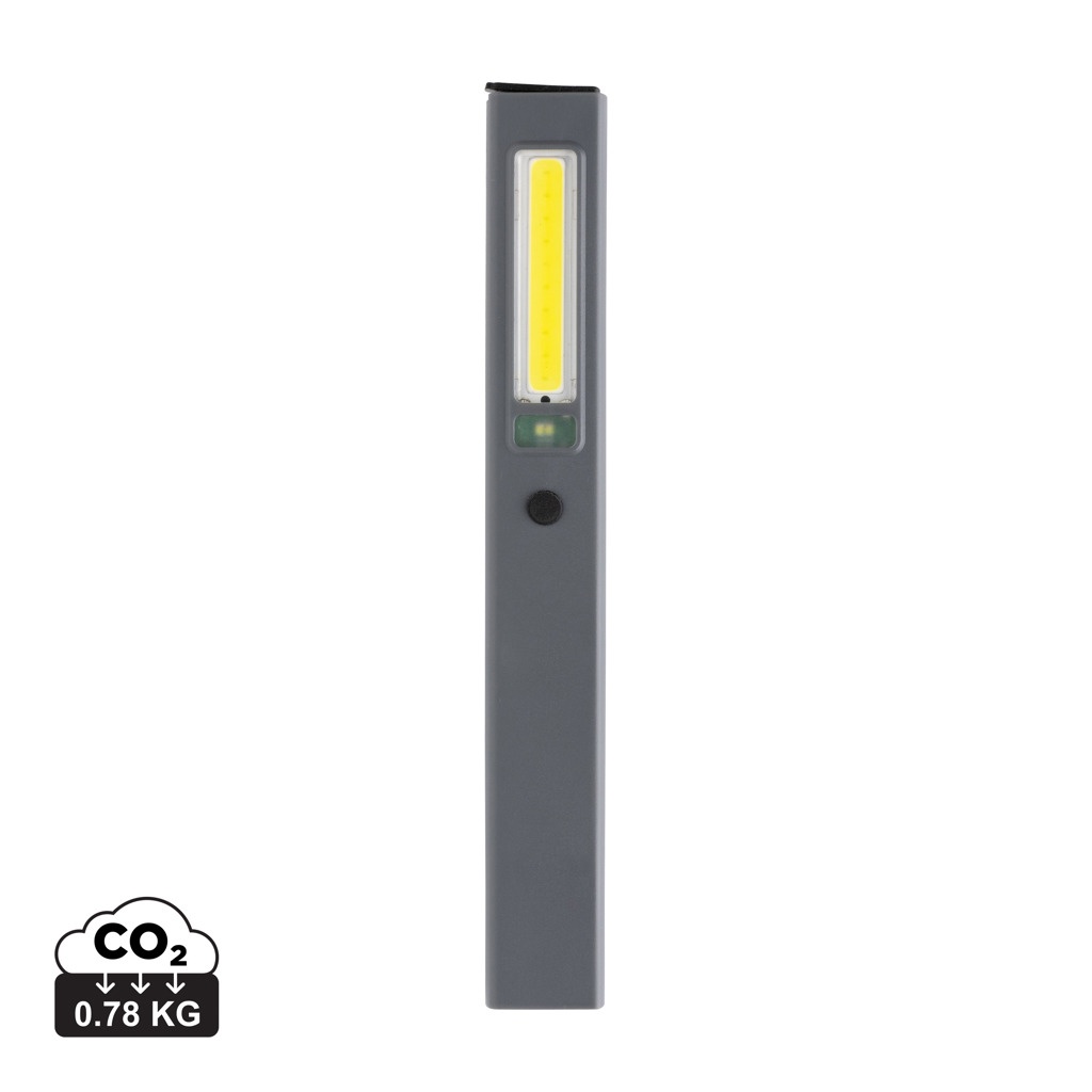 Карманный инспекционный фонарь из переработанного АБС-пластика, сертифицированного RCS. Общее содержание переработанных материалов: 33% от общего веса изделия. Сертификация RCS гарантирует полностью сертифицированную цепочку поставок переработанных материалов. Рабочий фонарь использует перезаряжаемую литиевую батарею класса А емкостью 520 мАч, поэтому нет необходимости заменять батареи. Просто подзаряжайте через разъем USB. Рабочий фонарь поставляется с COB-светильником 220 люмен и светодиодным светом 80 люмен. С 3 режимами: светодиодный, COB и COB-красный. С зажимом для крепления на поясе или кармане и магнитом. С портом типа C для подзарядки. Время работы на одной зарядке: 3 часа.
