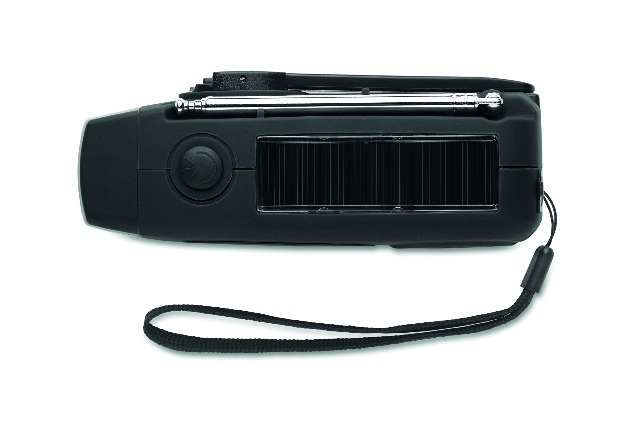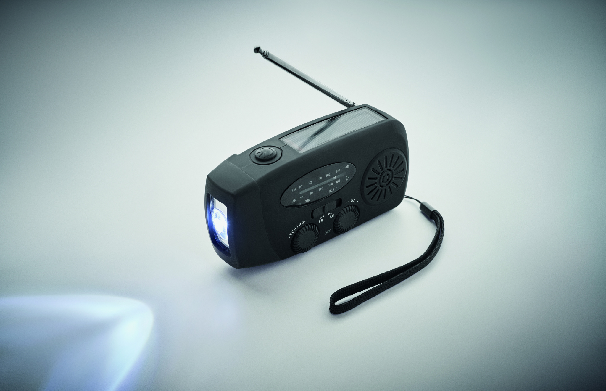 Portable AM/FM radio in ABS with LED Torch (2 settings) and a 1200mAh Power bank for emergency charging. Self powered by solar and hand crank.
