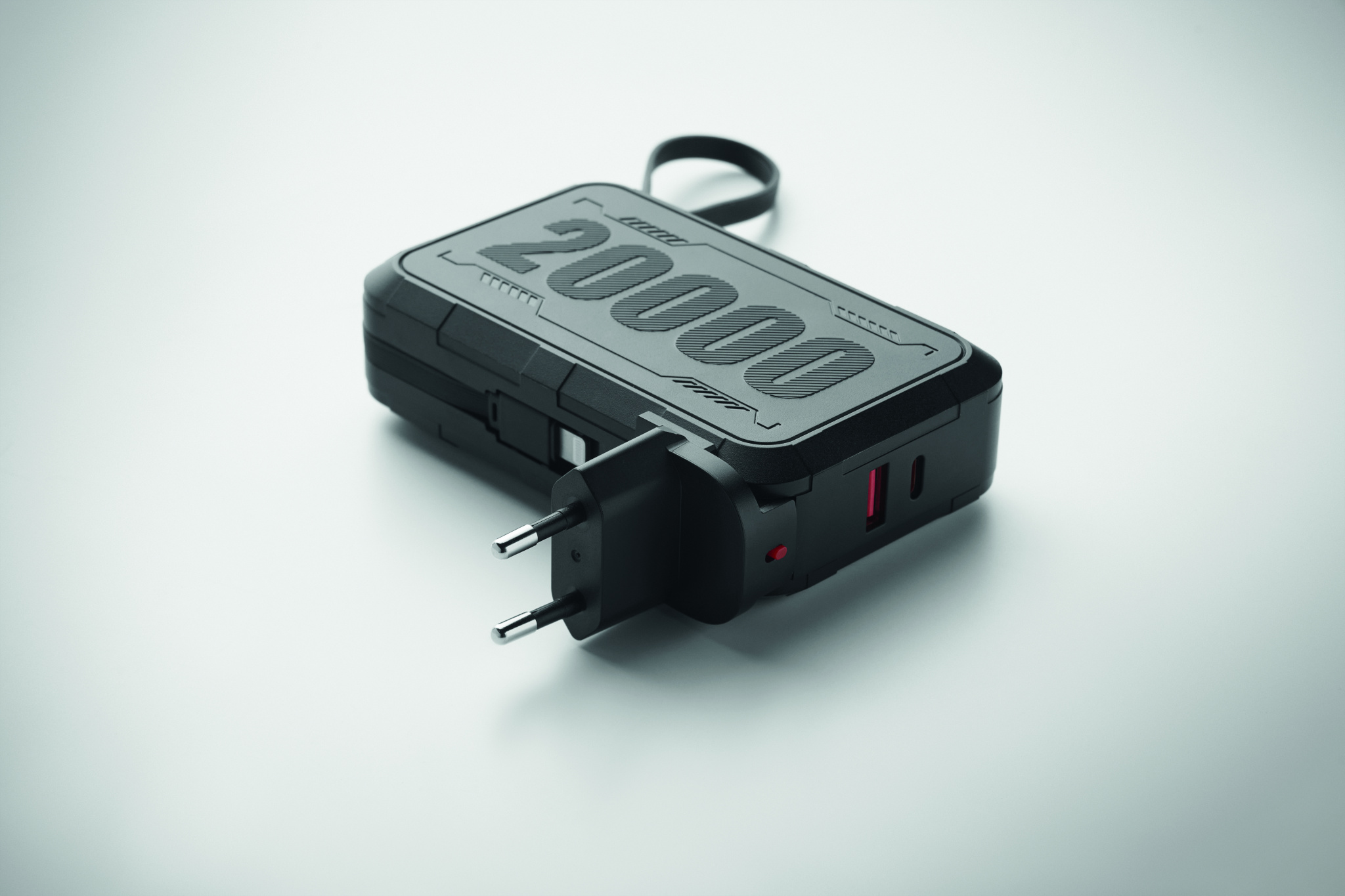 Power bank 20000 mAh in ABS with built-in US plug and removable AC plug. USB A and type-C in/out. Type-C and 2 in 1 pin integrated cables.