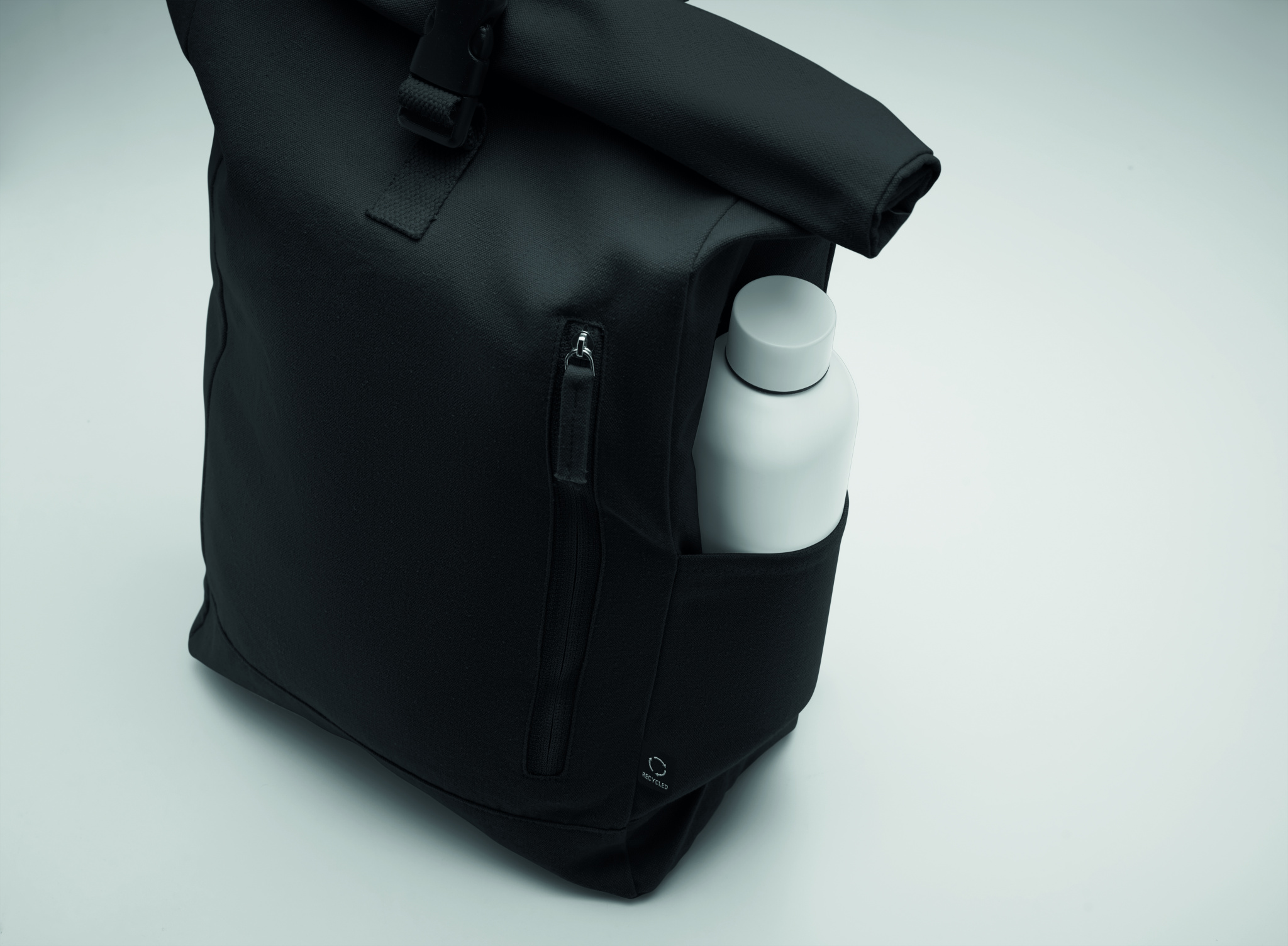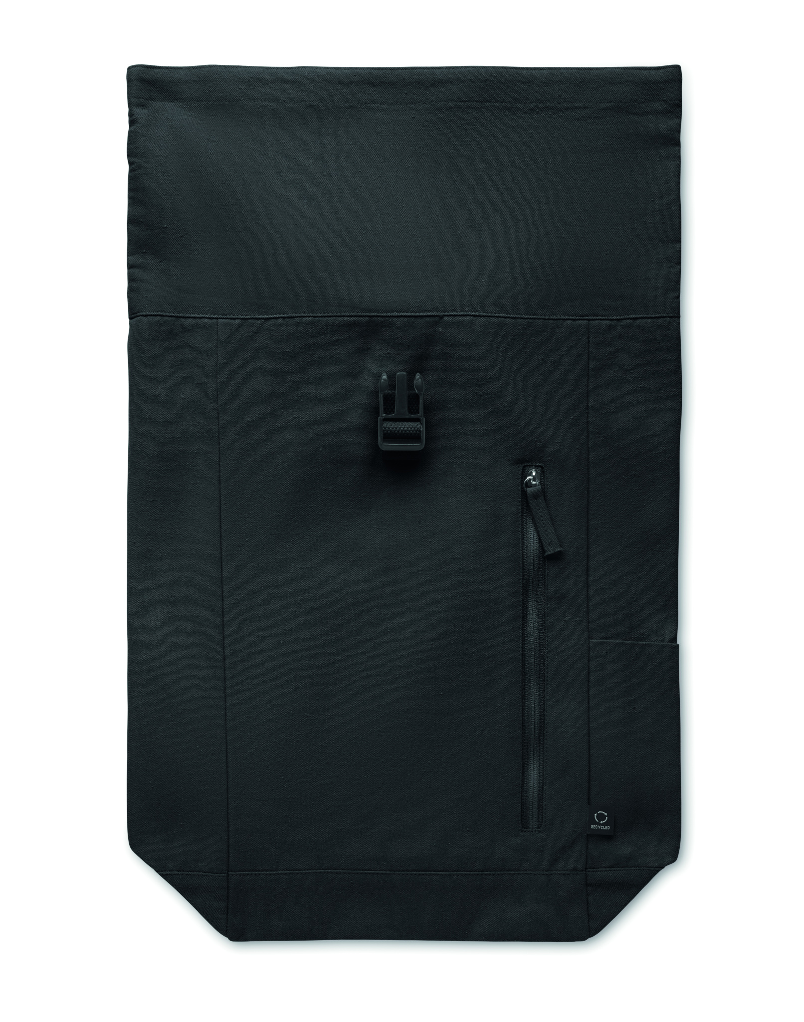 Roll top backpack with hook and loop closure in 390 gr/m² recycled cotton (80%) and recycled polyester (20%). Zippered front pocket.