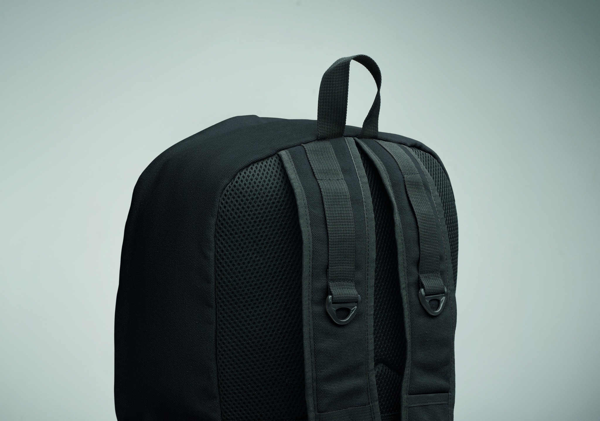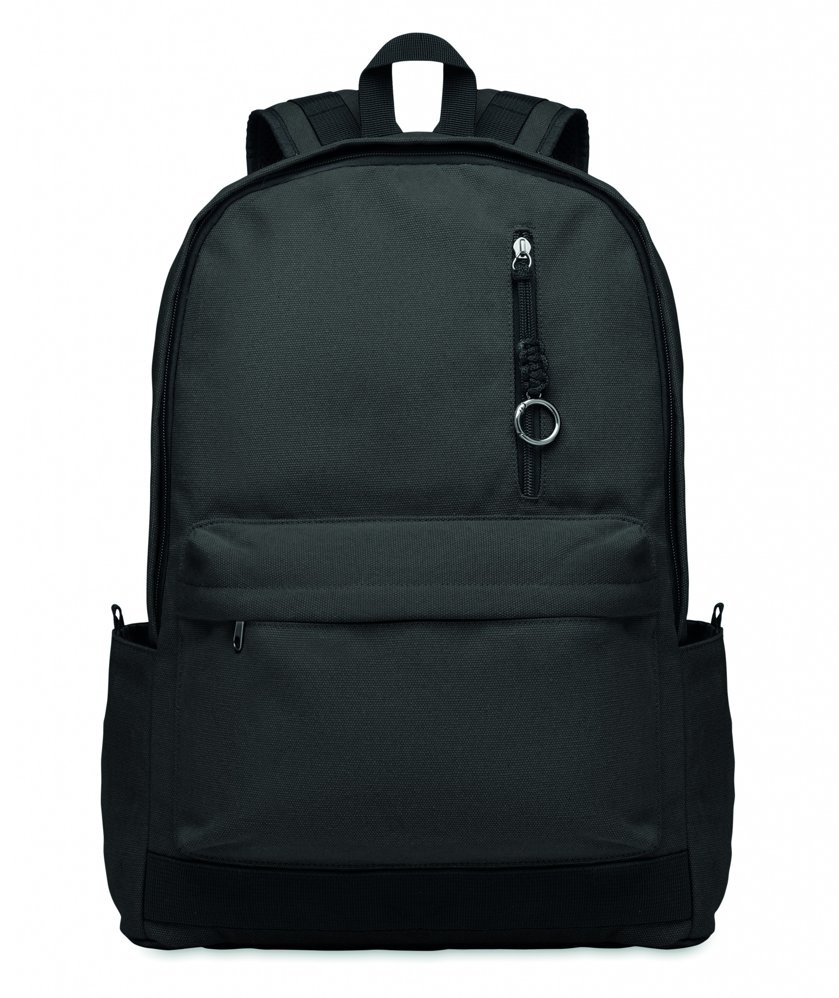 Рюкзак для 15-дюймового ноутбука из переработанного хлопка. Большой передний карман на молнии с внутренним отделением для ноутбука. Маленький передний карман на молнии. Два боковых накладных кармана. Спинка и плечевые ремни, задняя панель и дно с мягкой подкладкой. 450 гр/м².