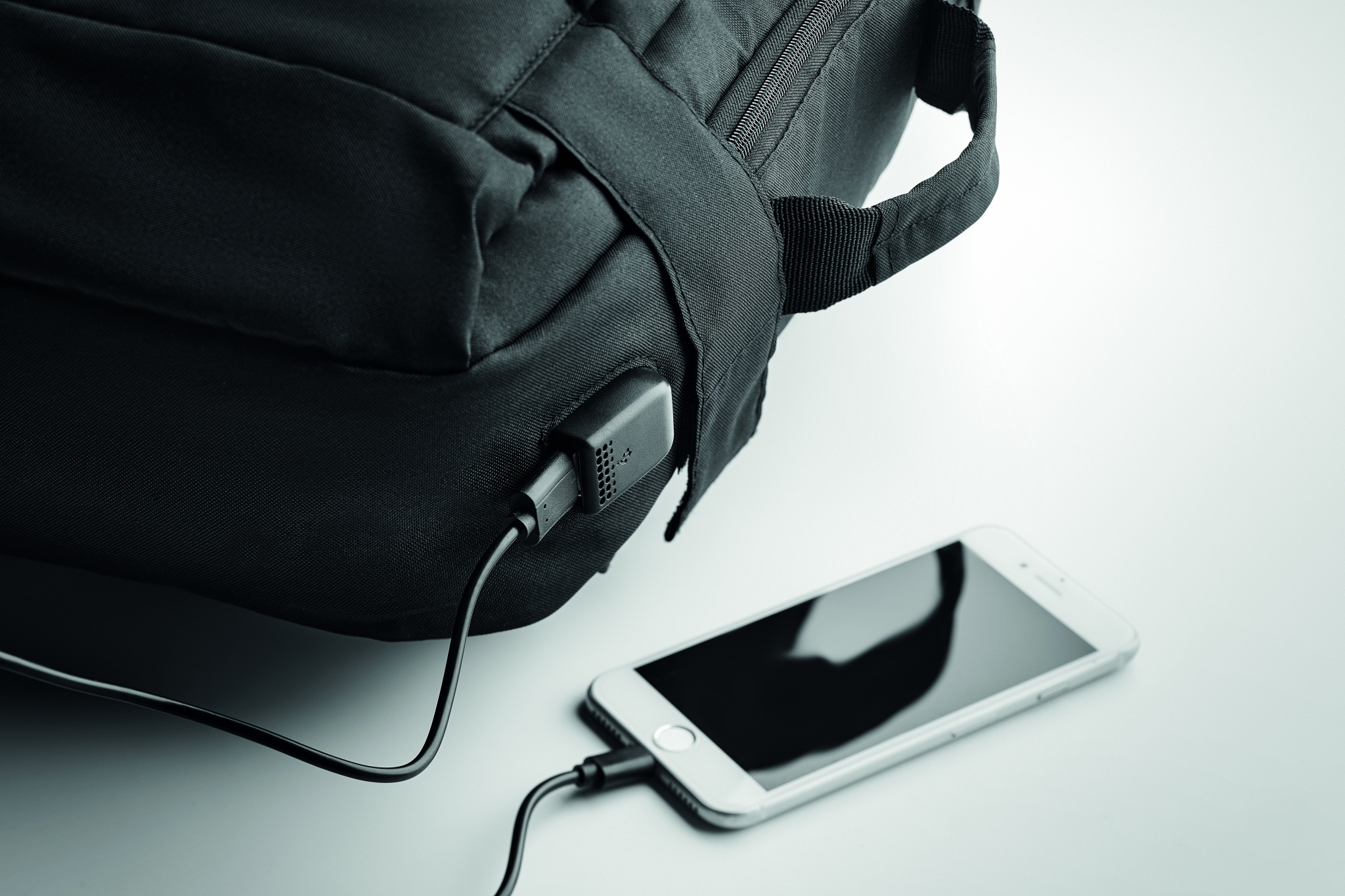 Рюкзак для ноутбука из RPET 300D с мягким плечевым ремнем. Основное внутреннее отделение для 15-дюймового ноутбука. В комплекте USB-кабель для подзарядки.
