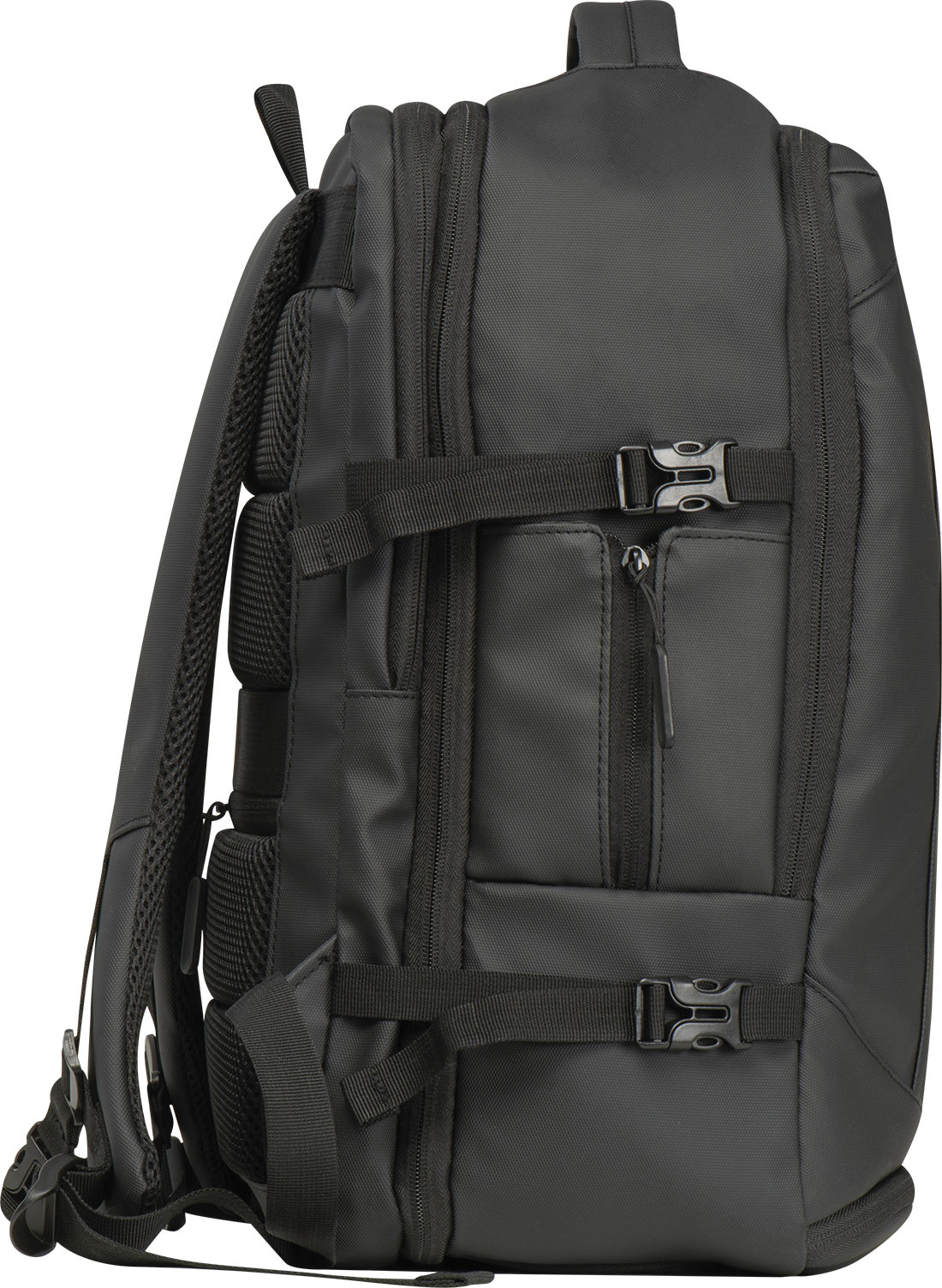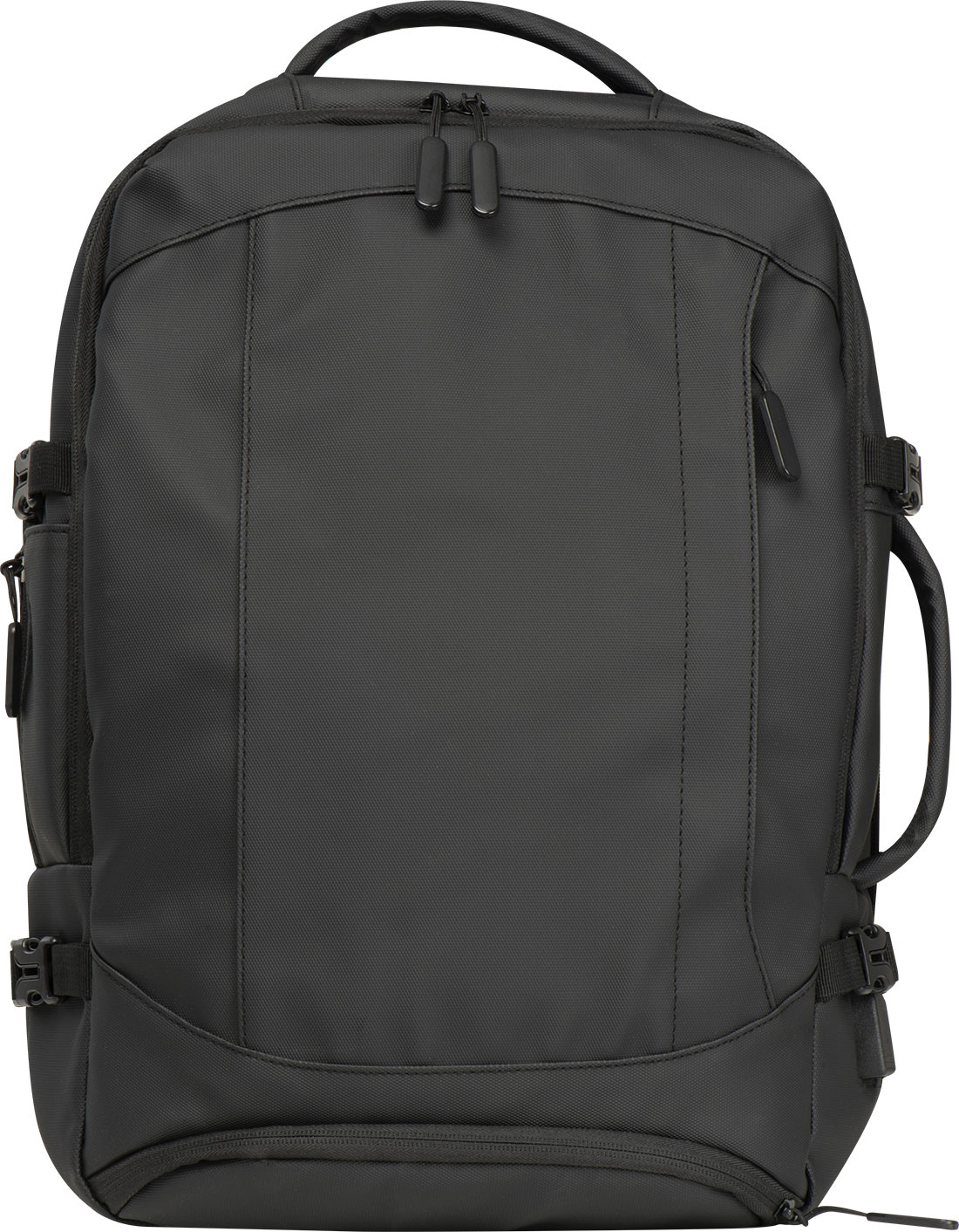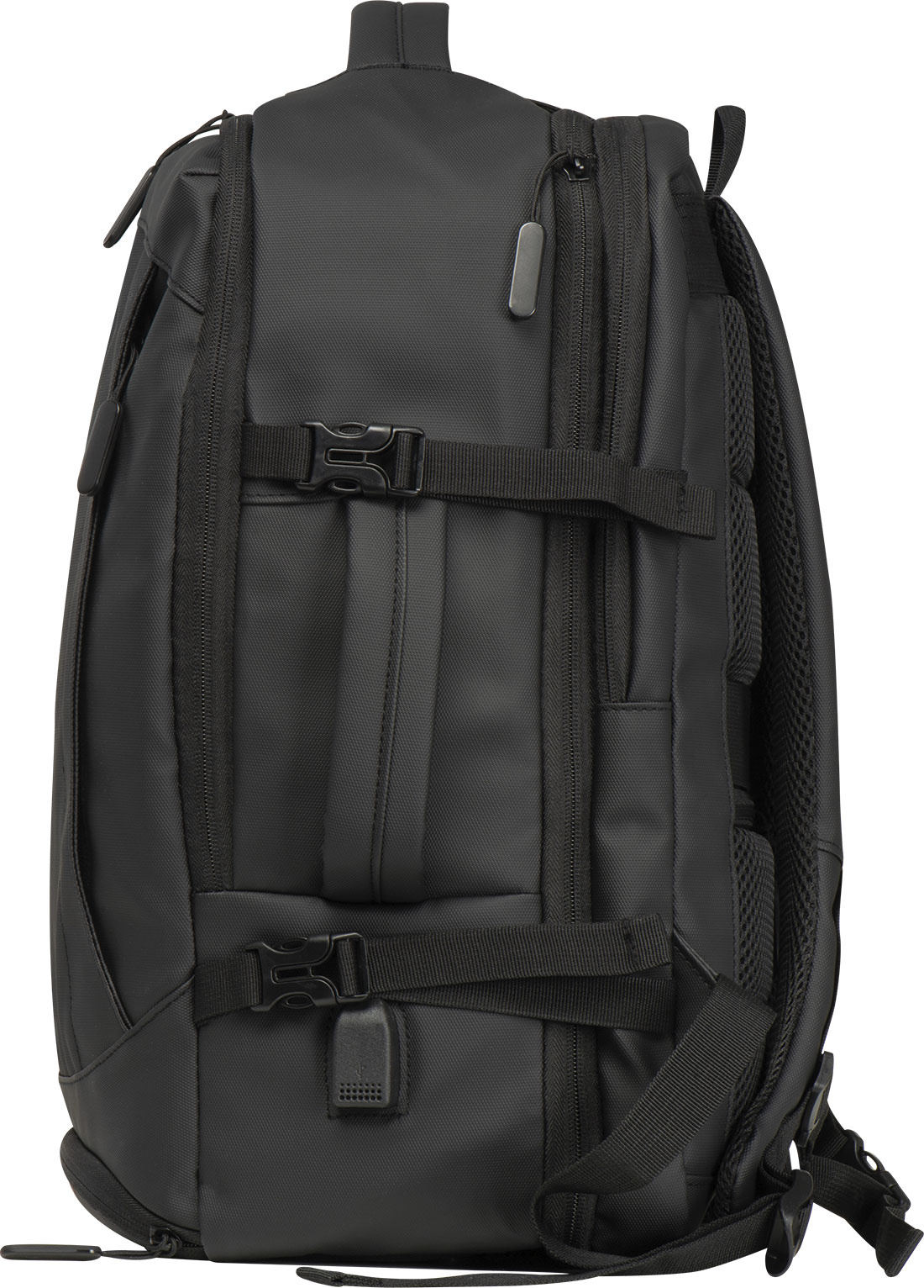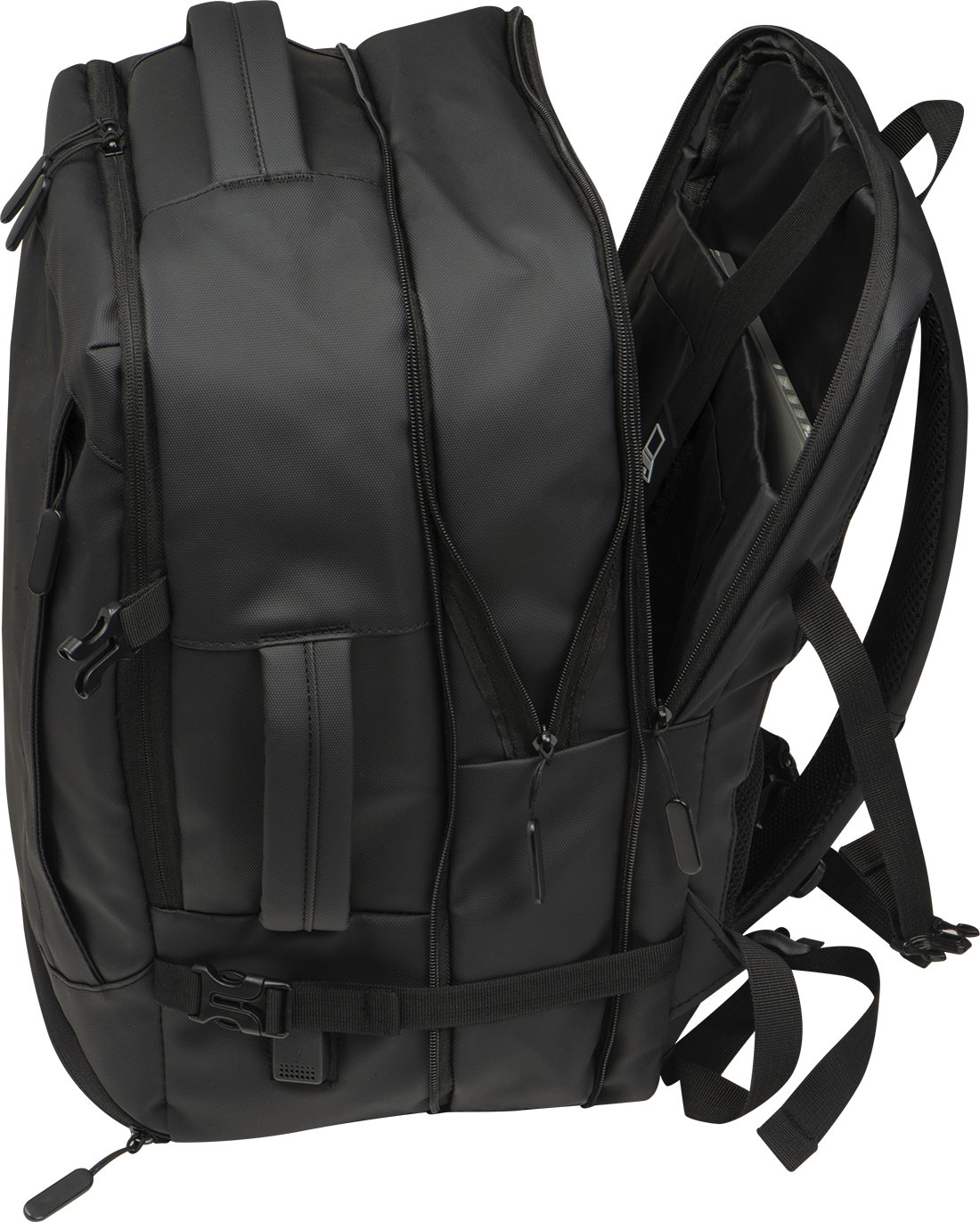 Высококачественный рюкзак из полиэстера 300D. Этот водонепроницаемый рюкзак имеет несколько отделений: отделение для ноутбука с застежкой и дополнительным накладным карманом, защитный карман сзади, боковой карман с сетчатой вставкой и расширяемой молнией, отделение для мусора внизу, мягкий накладной карман под передней частью, передний боковой карман на молнии, различные внутренние накладные карманы. Кроме того, он включает в себя порт USB с кабелем, две ручки для переноски, ремень для тележки, мягкие плечевые ремни, мягкую спинку и молнию для расширения рюкзака. Идеальный компаньон не только для деловых поездок.