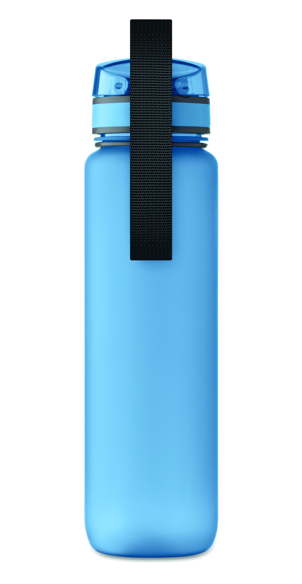 Sports water bottle in RPET, motivational time markings, one hand opening flip top lid, safety lock and carrying strap. Leak-free. Capacity: 1L.
