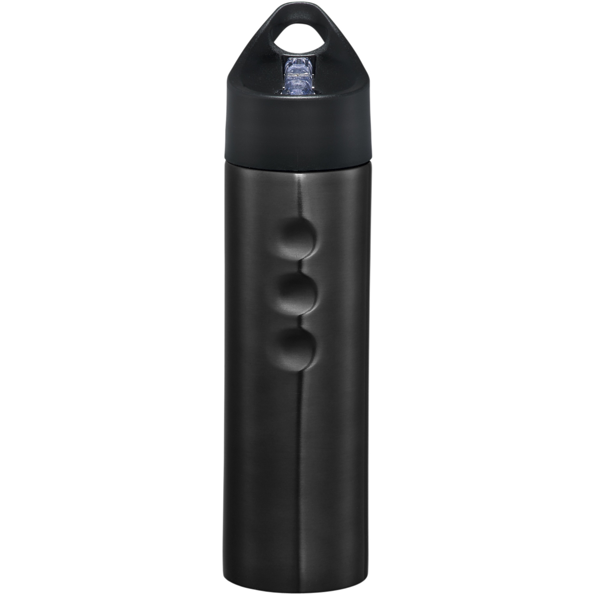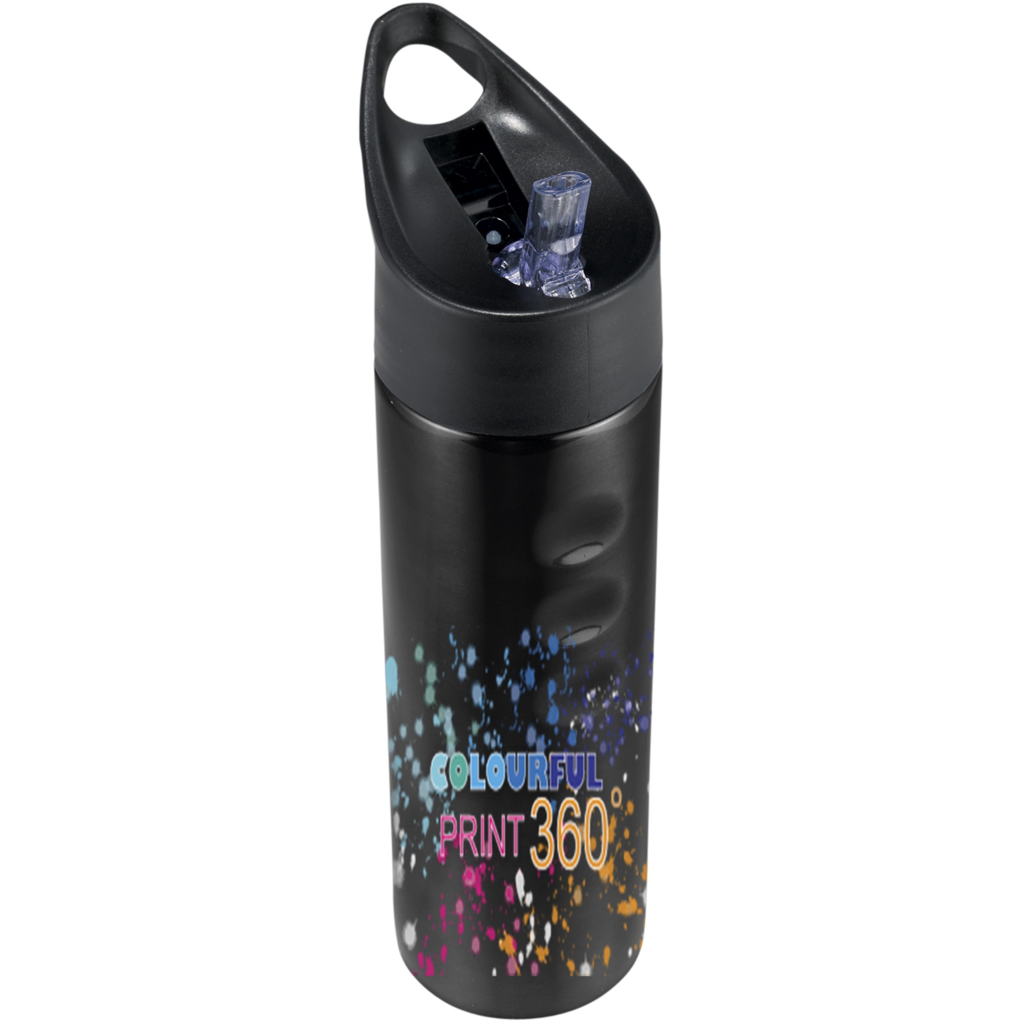 Одинарные стенки. Откручивающаяся крышка с защитой от протекания и отверстием для питья. Резиновый грипп для пальца сбоку- для удобства в использовании. Объем 750 мл.