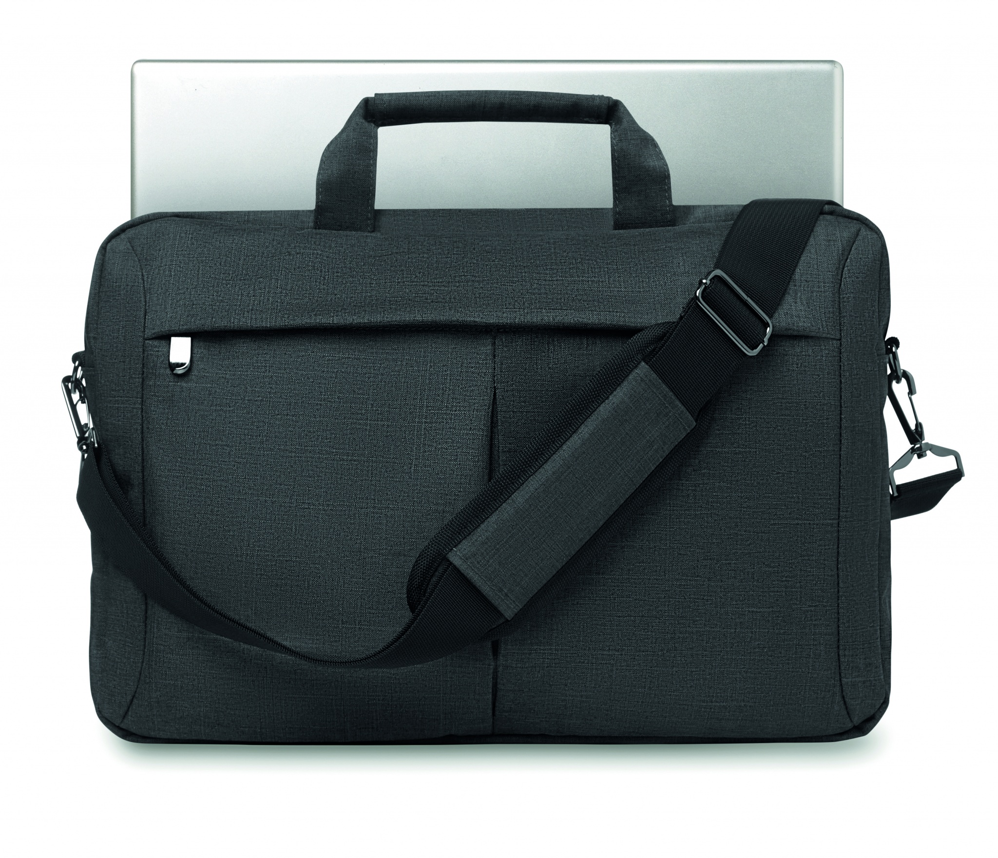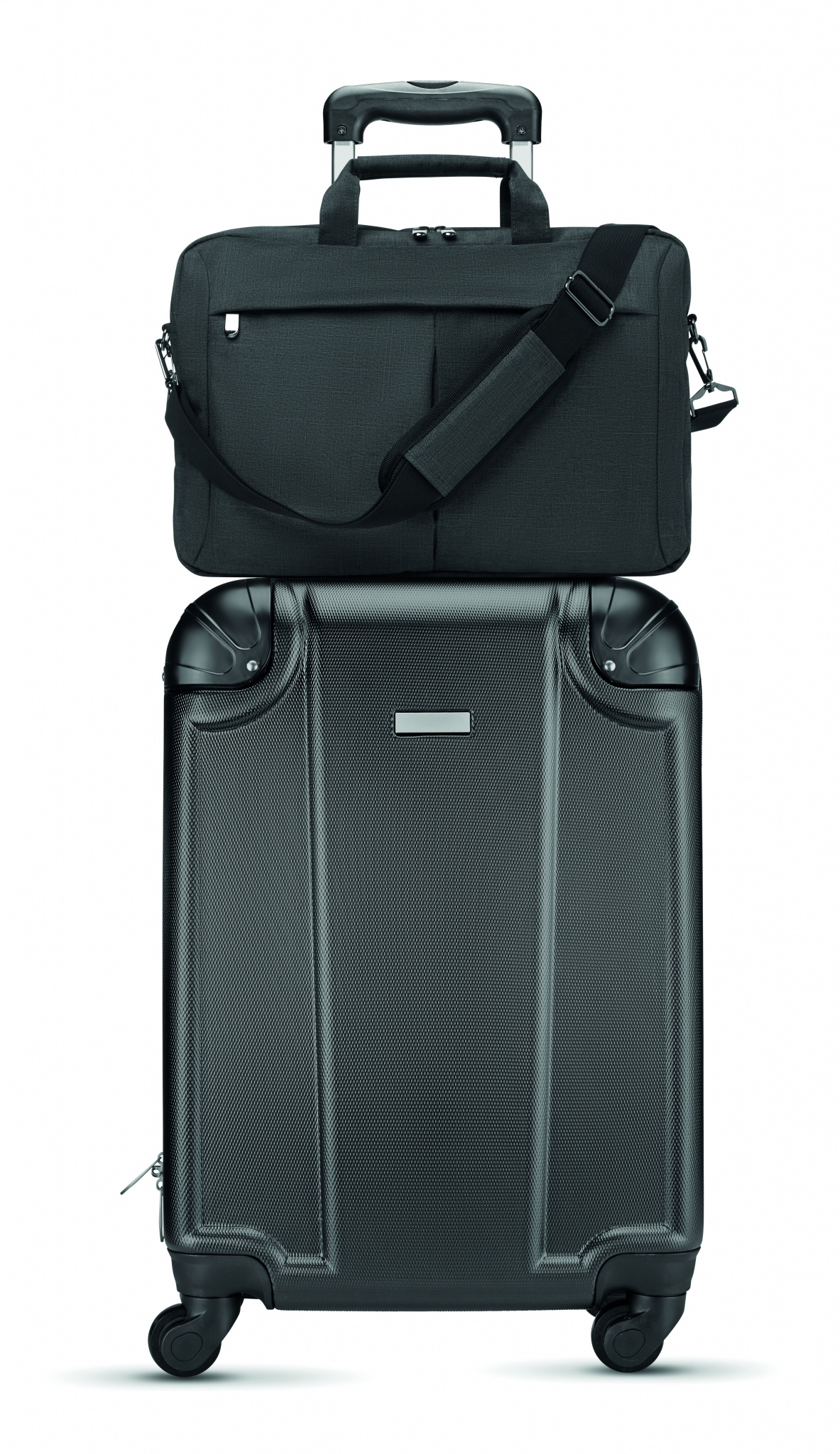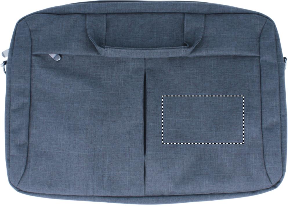 Сумка для ноутбука из полиэстера со съемным ремнем для крепления на чемодане. Имеет наружный карман на молнии, а также отделения для письменных принадлежностей.
