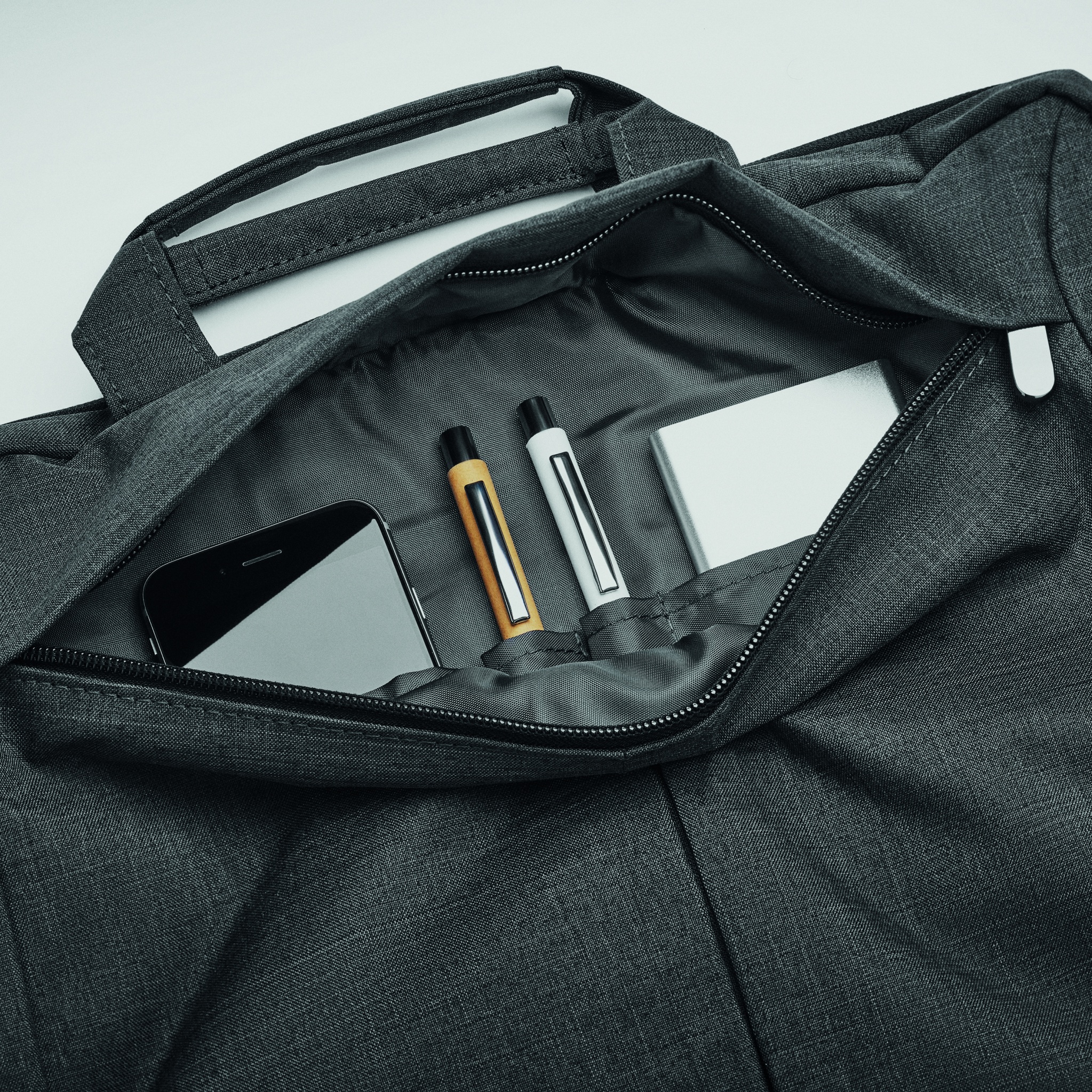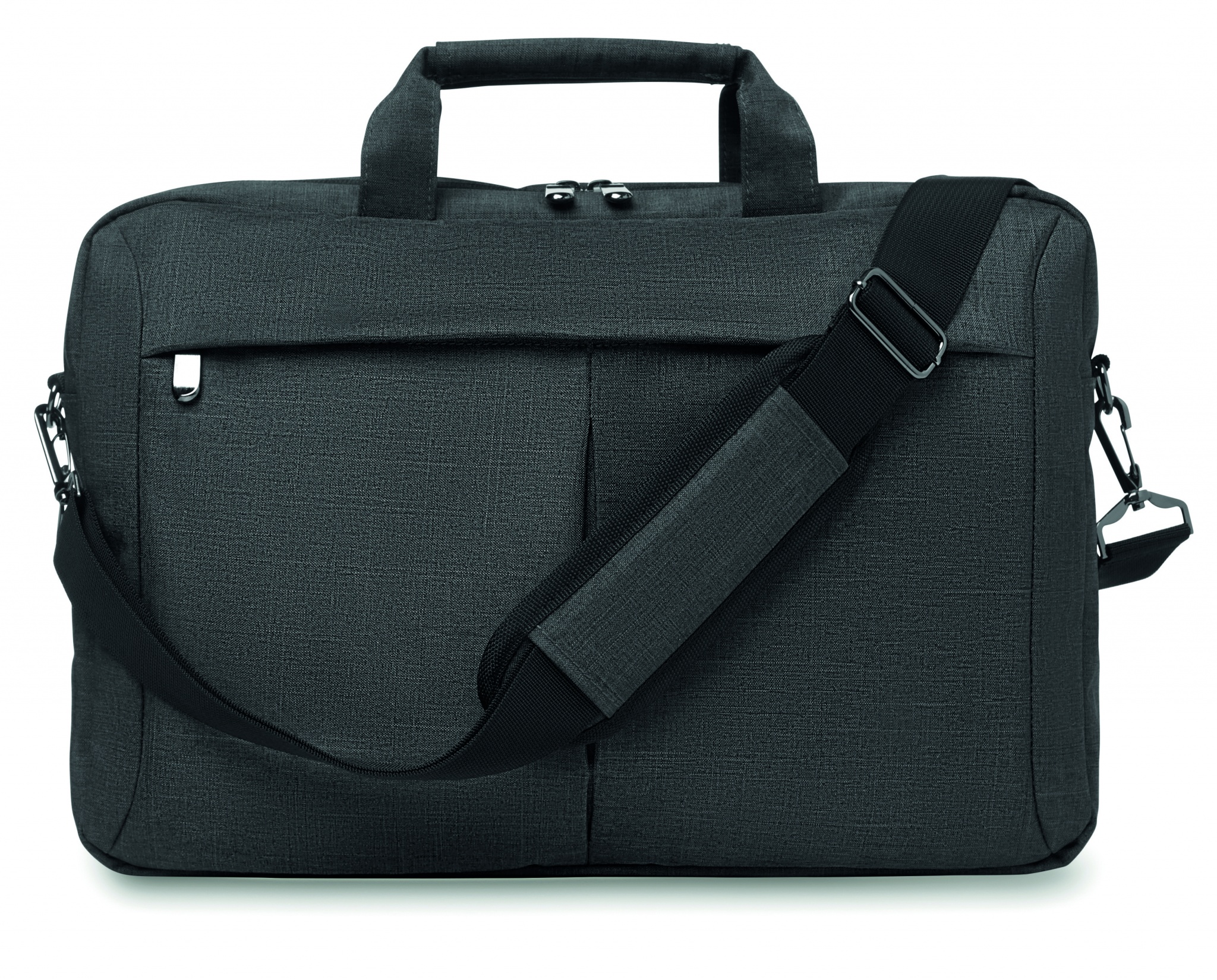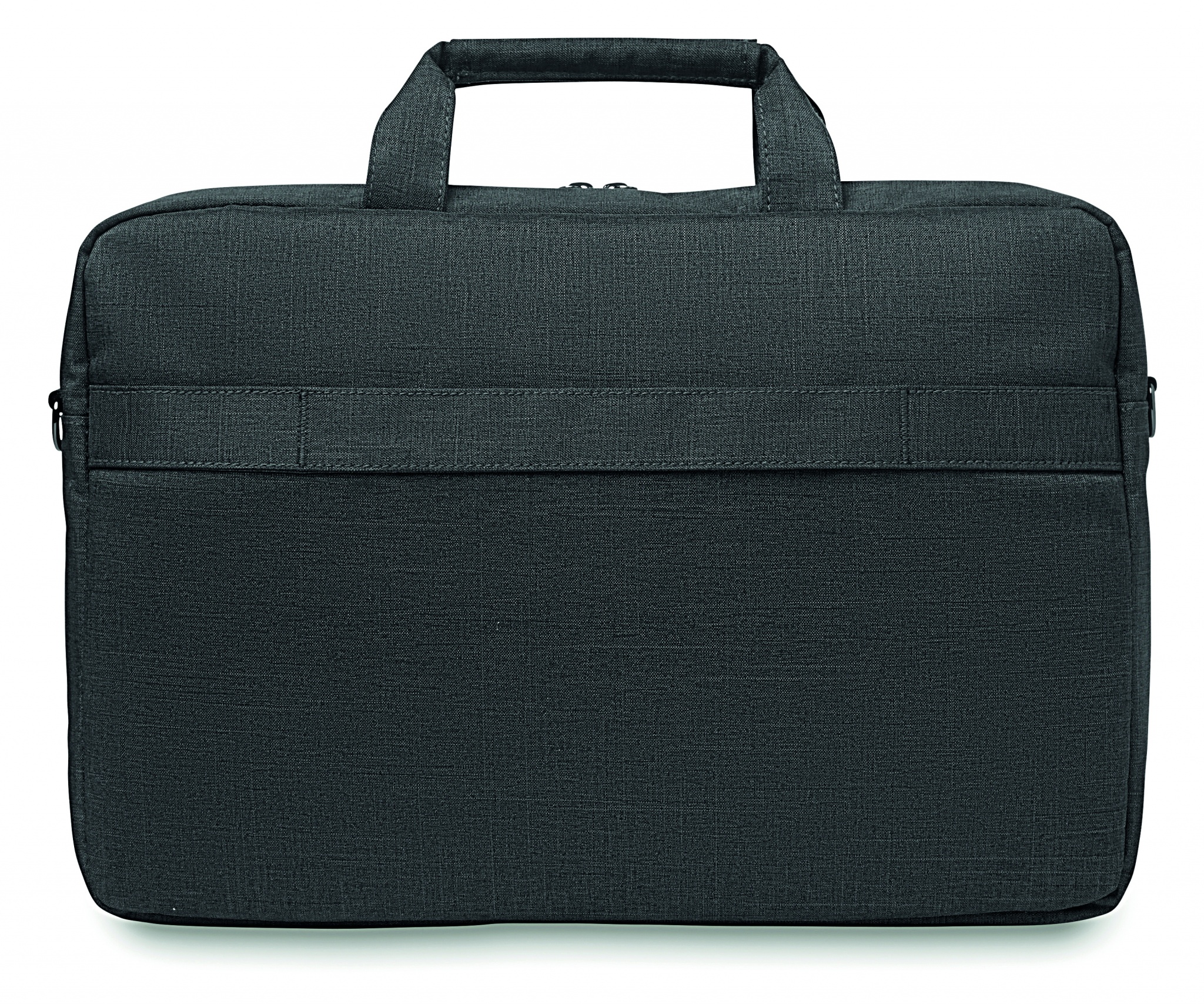 Сумка для ноутбука из полиэстера со съемным ремнем для крепления на чемодане. Имеет наружный карман на молнии, а также отделения для письменных принадлежностей.