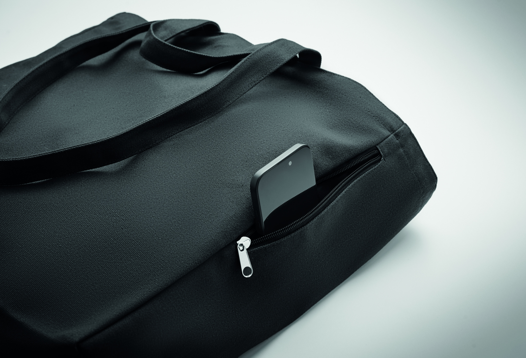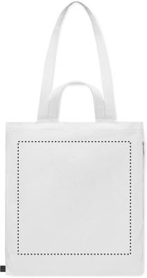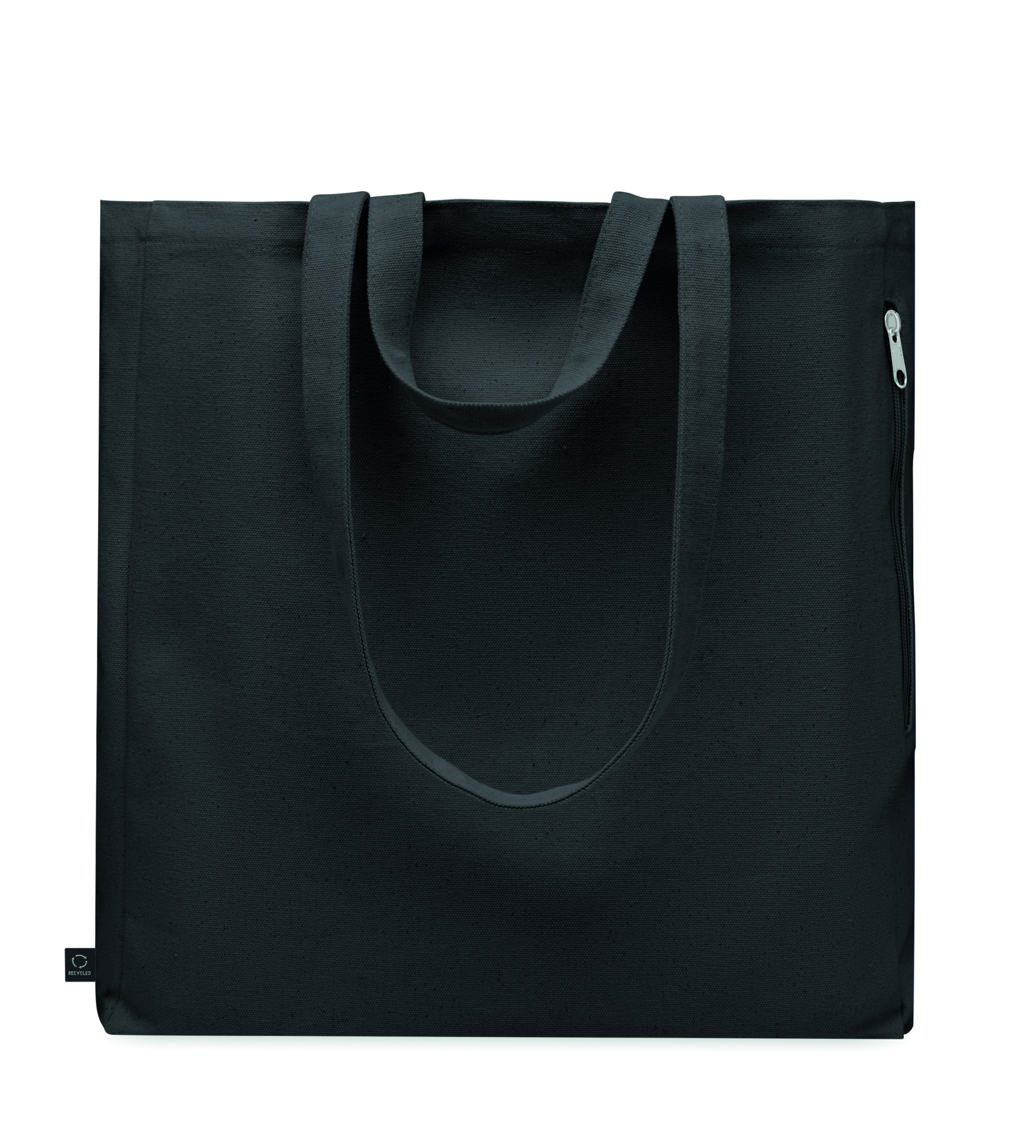 Recycled polycotton shopping or beach bag (70% recycled cotton, 30% recycled polyester) with short and long handles. It has a side zippered pocket. 380 gr/m².