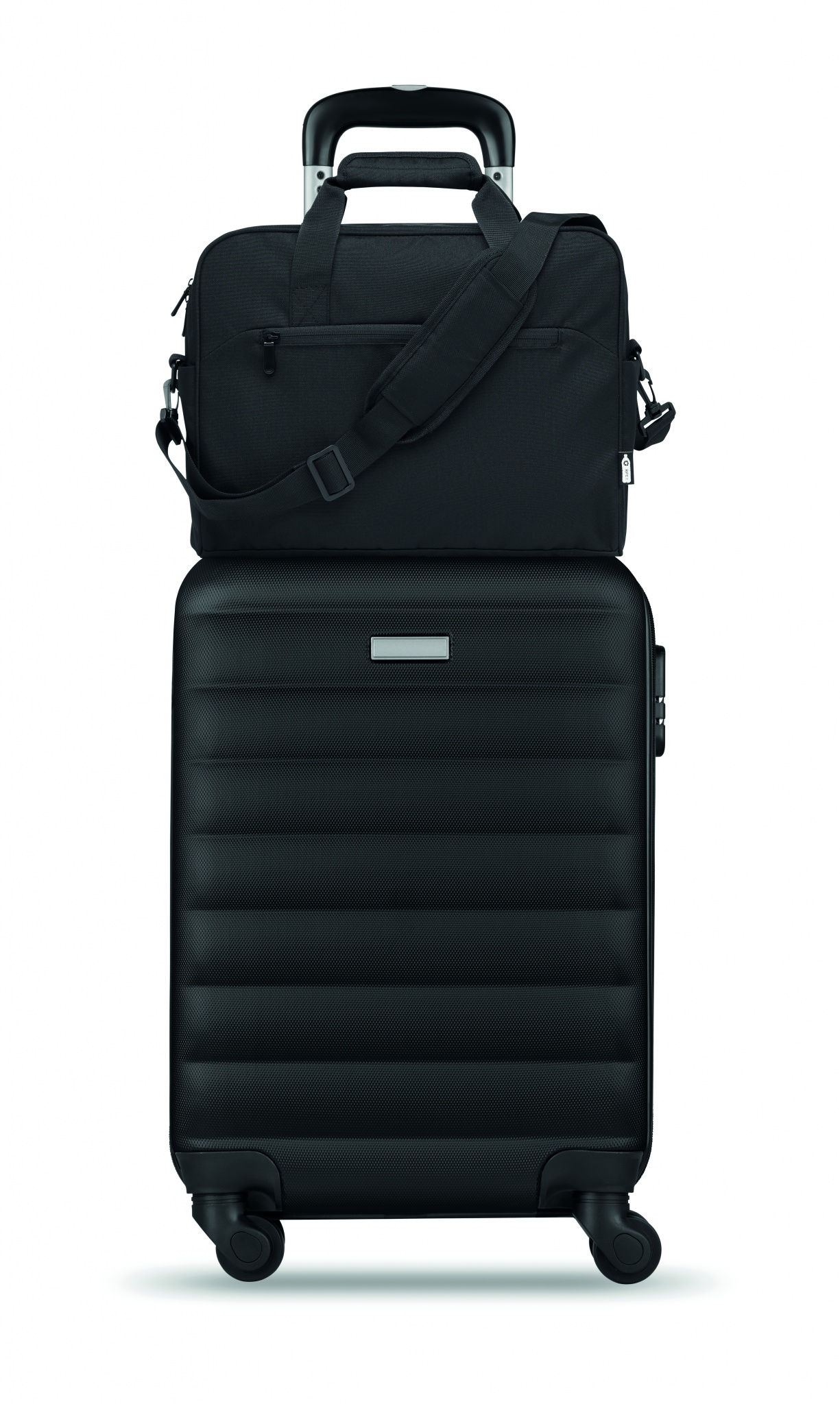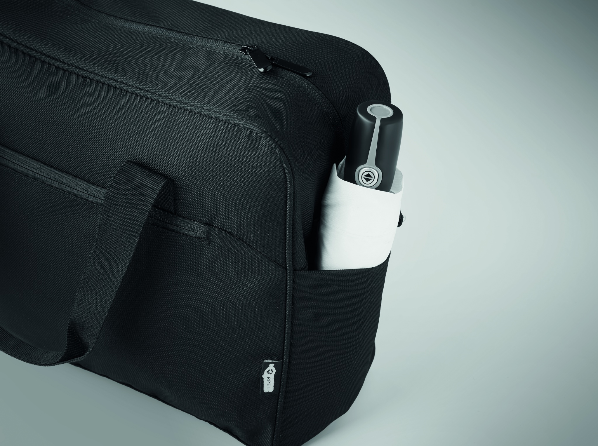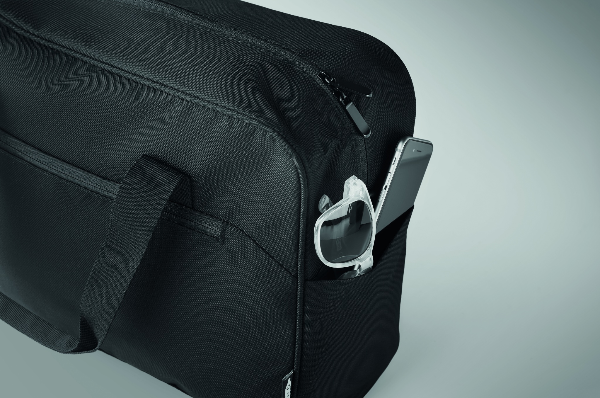 Дорожная сумка из материала 600D RPET с большим передним карманом на молнии и двумя маленькими боковыми карманами. Включает отделение для 15-дюймового ноутбука. Съемный регулируемый плечевой ремень с мягкой подкладкой. Держатель для чемодана на обратной стороне.