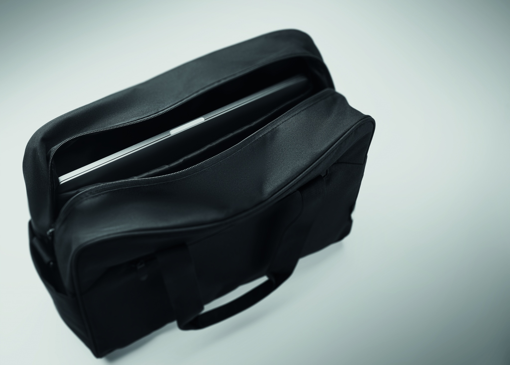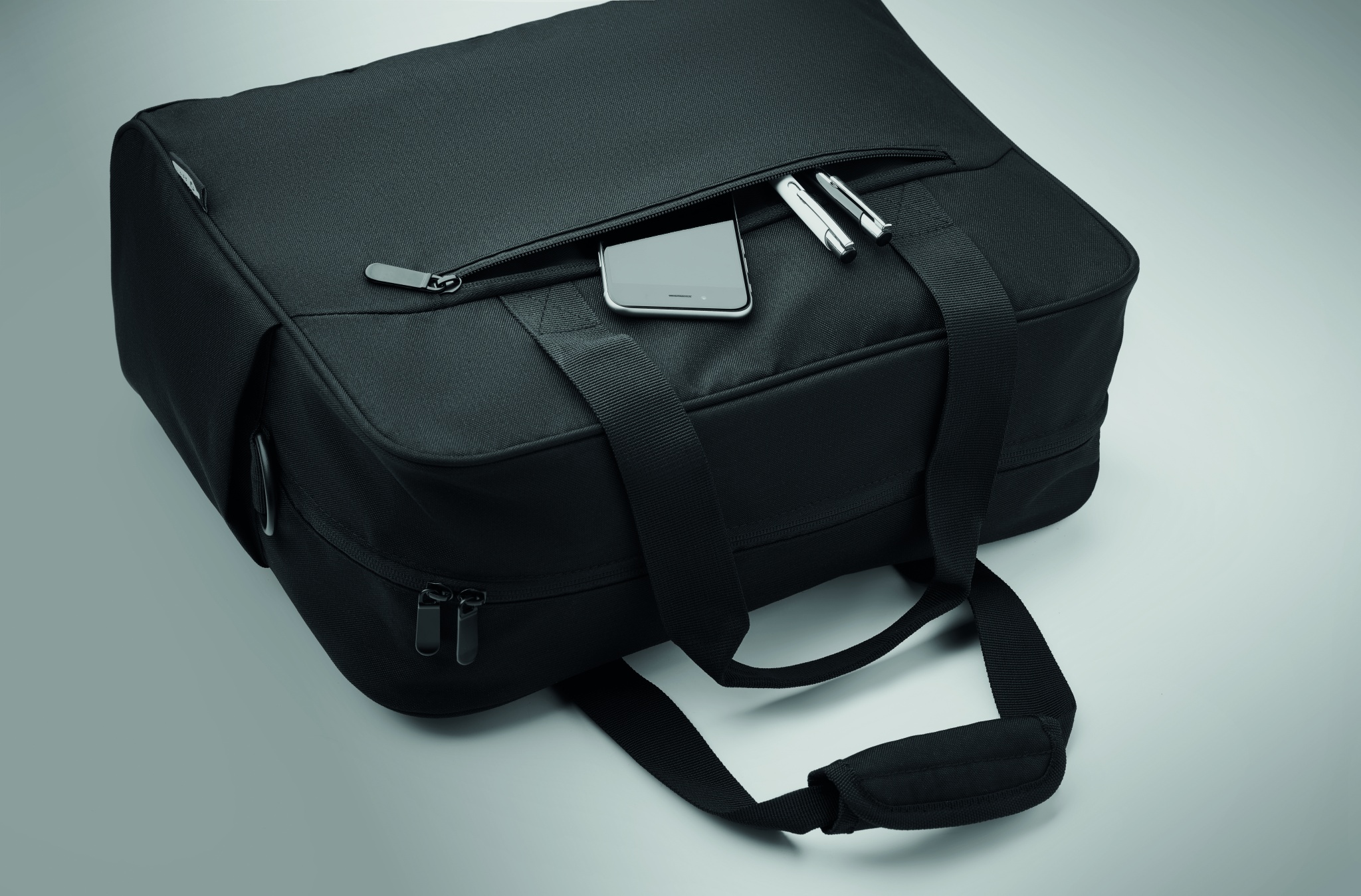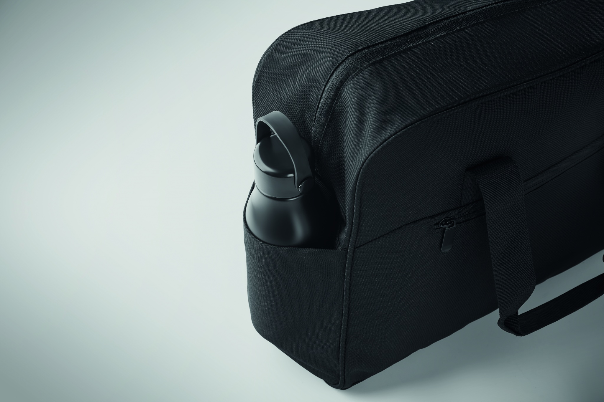 Дорожная сумка из материала 600D RPET с большим передним карманом на молнии и двумя маленькими боковыми карманами. Включает отделение для 15-дюймового ноутбука. Съемный регулируемый плечевой ремень с мягкой подкладкой. Держатель для чемодана на обратной стороне.