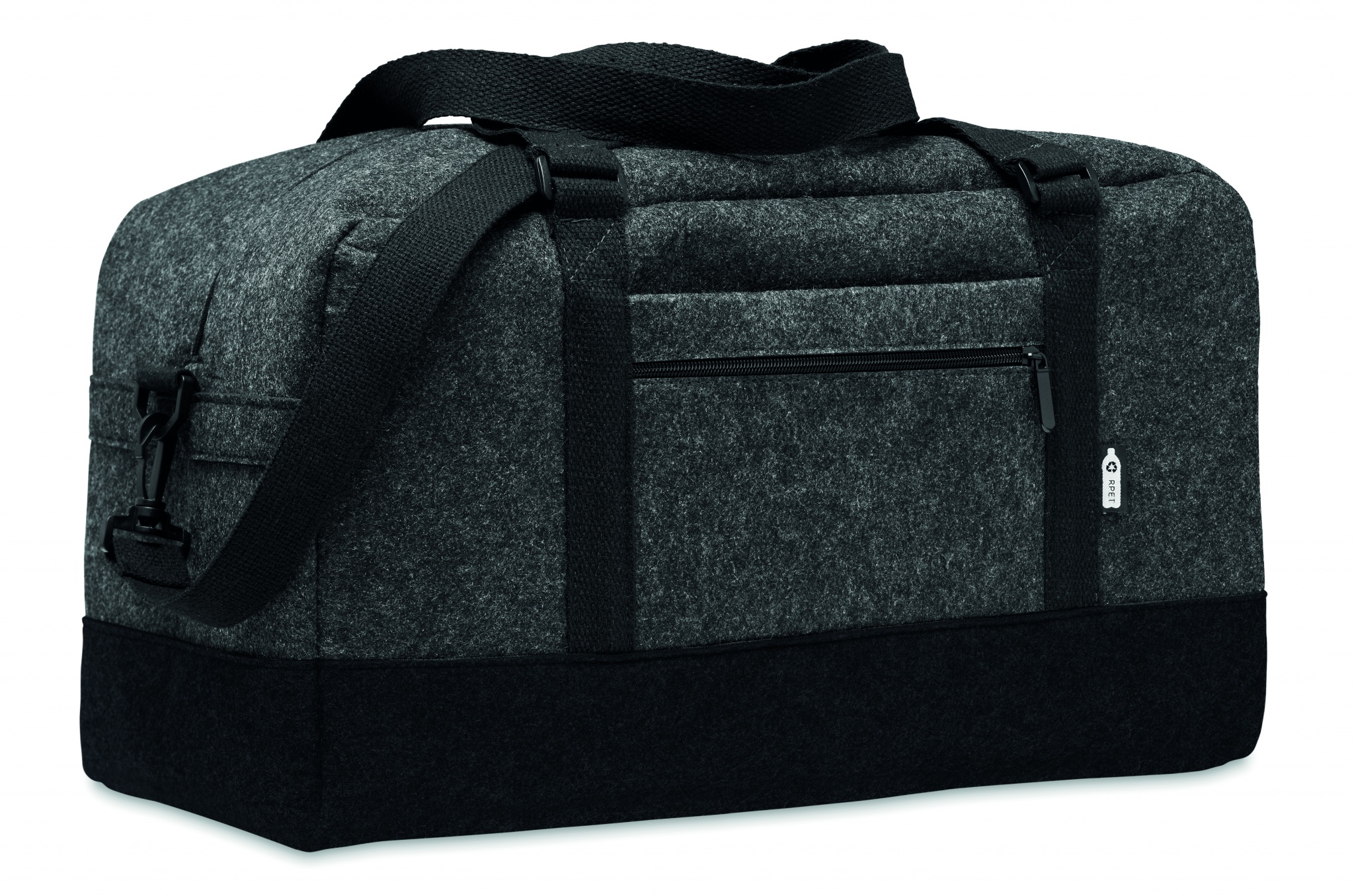 Сумка из переработанного фетра RPET, предназначеннная для спорта/фитнеса или для небольших поездок . Удобный передний карман на молнии, холщовые ручки и съемный регулируемый плечевой ремень.