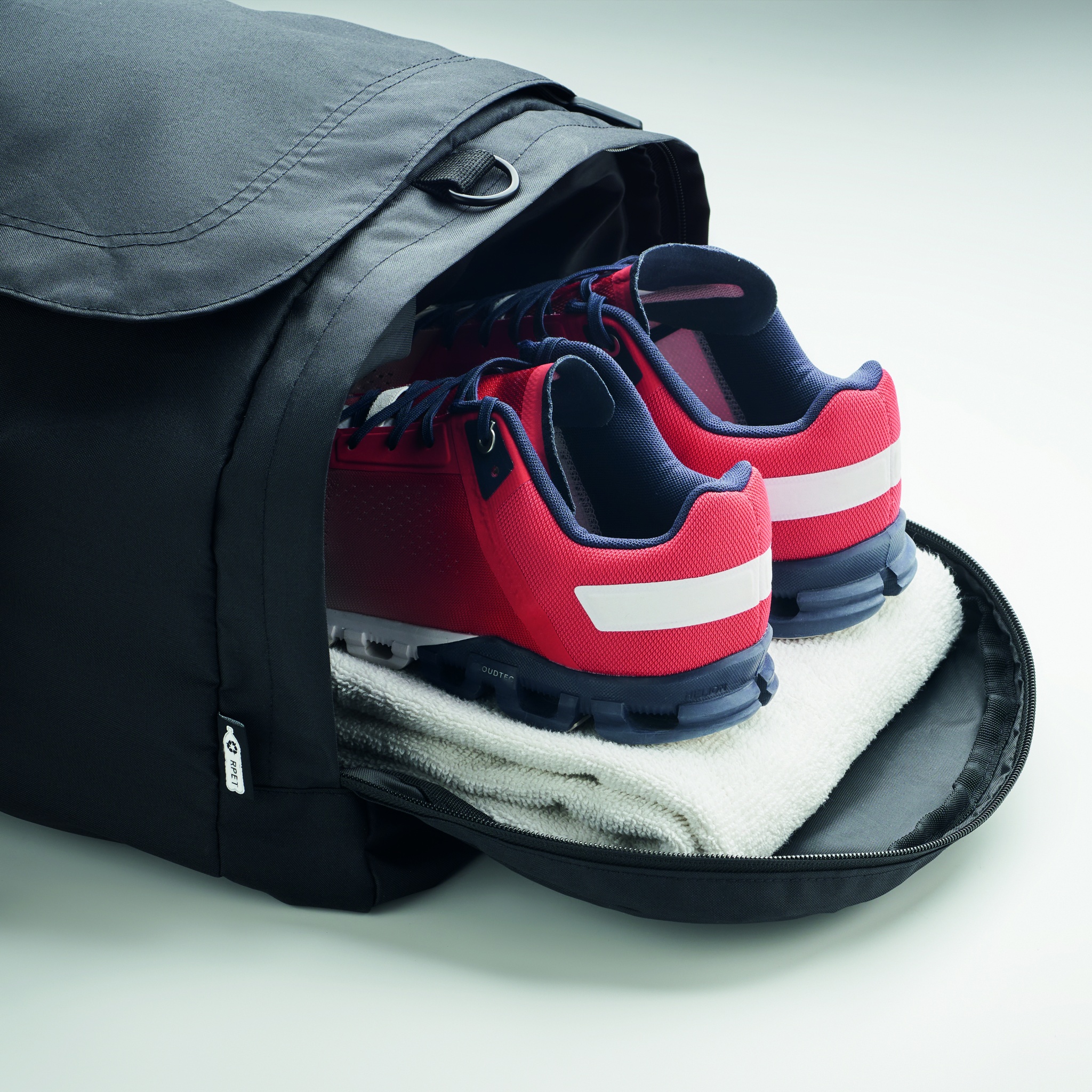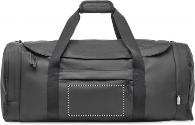Большая спортивная или дорожная сумка из полиэстера 300D RPET. Основное отделение с боковым термо карманом на молнии. Съемная усиленная нижняя часть и регулируемый съемный плечевой ремень.