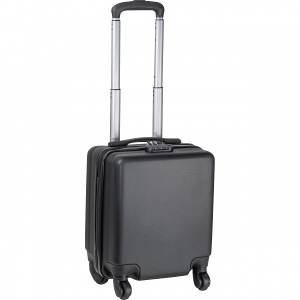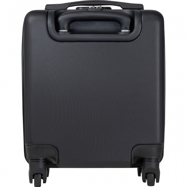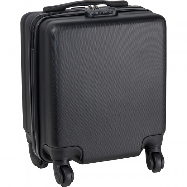 Черная тележка, идеально подходящая для размещения под сиденьем самолета. В ней есть место для ноутбуков до 14 дюймов и дополнительное место для хранения личных вещей. Идеально подходит для деловых поездок или поездок на выходные — функциональная, стильная и удобная.