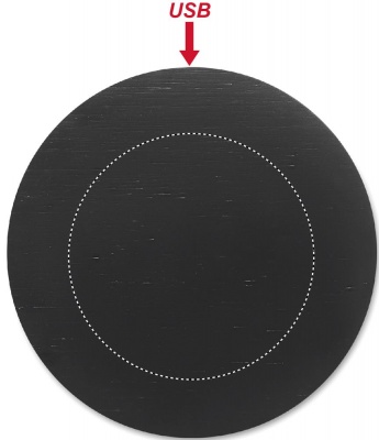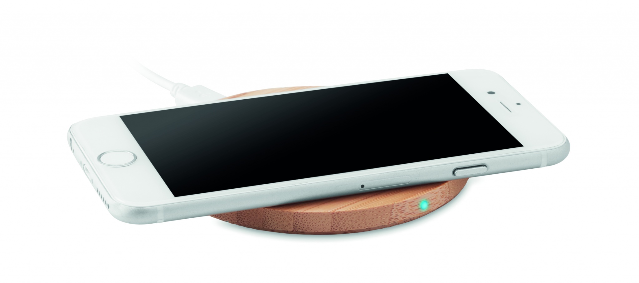 Беспроводное зарядное устройство из бамбука. При зарядке горит синий свет. DC9V/1.1A (10W). Совместимо со всеми устройствами с поддержкой QI, последними моделями Android, iPhone® 8 и новее.