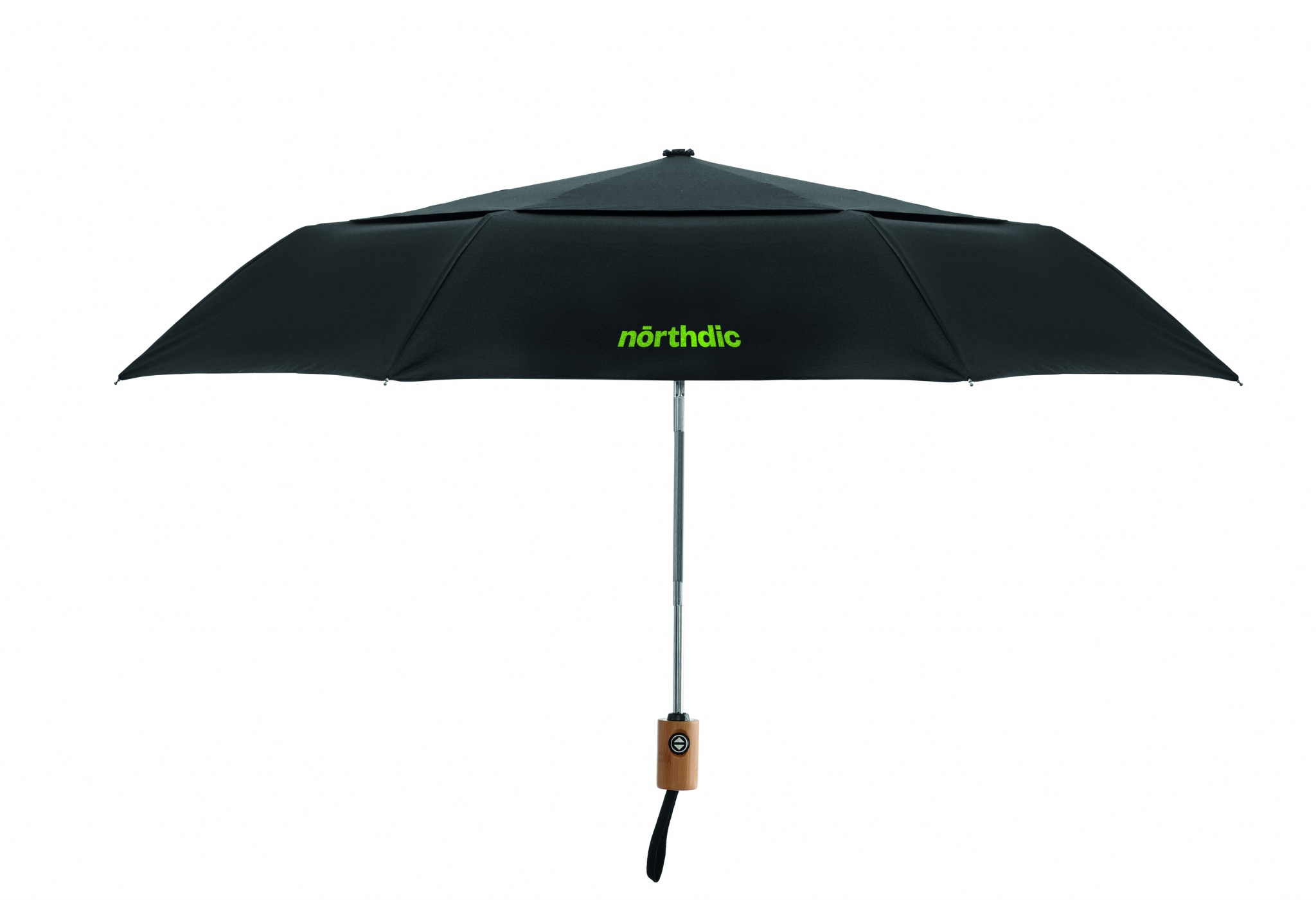 Ветроустойчивый зонт автомат 21 дюйм в 2 сложения из поликоттона 190T (70% полиэстера и 30% хлопка) с алюминиевыми стержнем и наконечниками и бамбуковой ручкой. Черные стекловолоконные спицы. В комплект входит подходящий чехол.