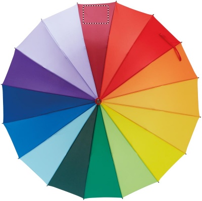 Автоматический 27-дюймовый зонт радужной окраски. Материал эпонж 190T. Деревянный стержень, спицы из стекловолокна, металлические наконечники. 16 панели.