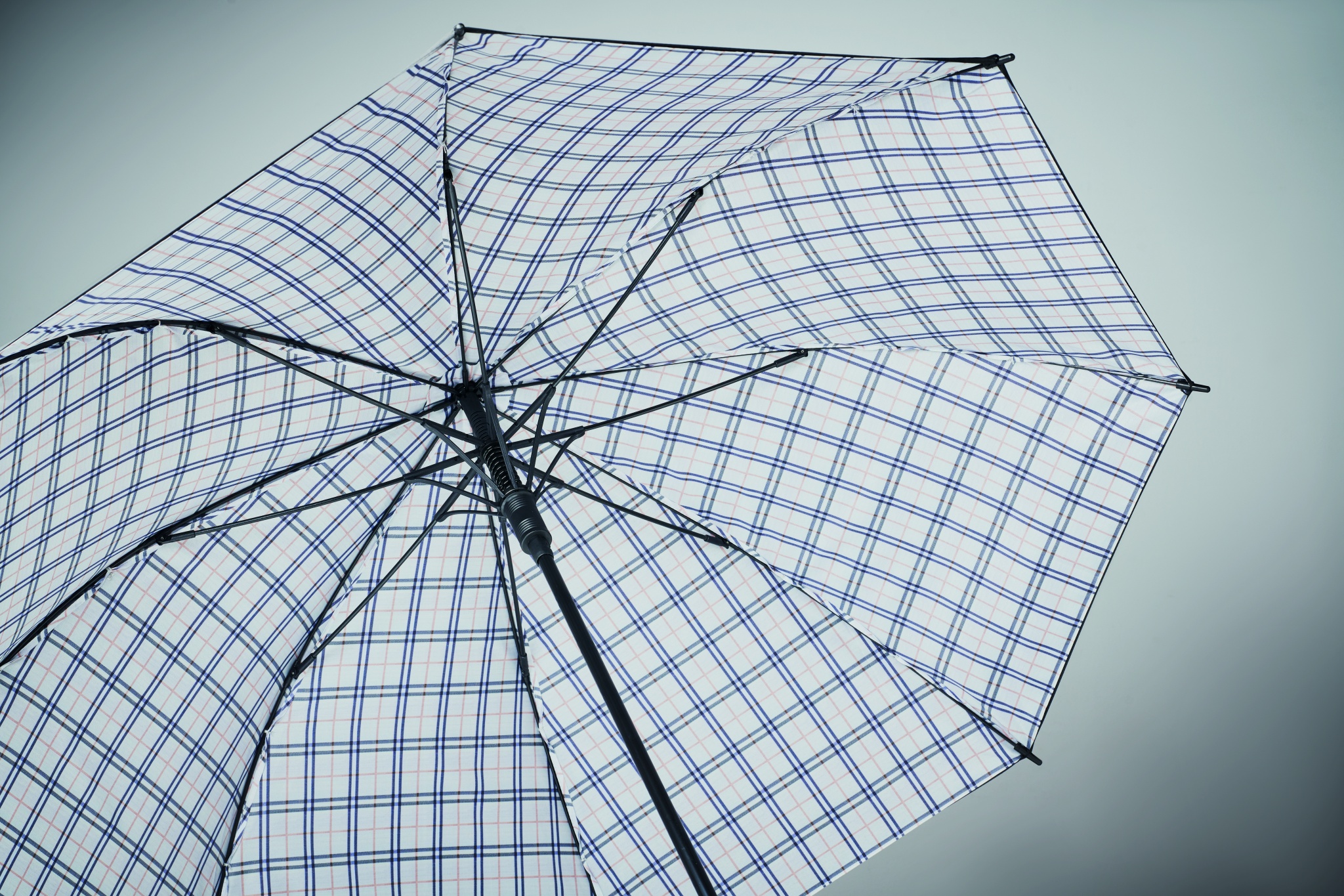 23-дюймовый ветроустойчивый зонт из эпонжа 190T с автоматическим раскрытием и рисунком в клетку. Каркас из стекловолокна с черным покрытием и пластиковыми наконечниками. Изогнутая ручка с резиновым покрытием. Ручное закрытие.
