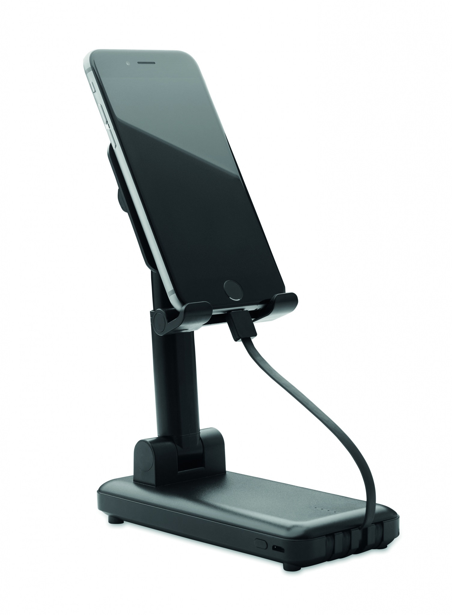 Kraftfull Powerbank på 10.000mAh i ABS med utdragbar och vikbar telefonhållare. Integrerade multikablar. Uteffekt: UTTAG: DC 5V/2A.