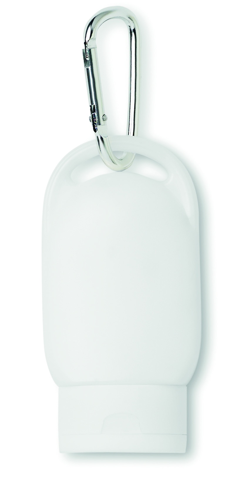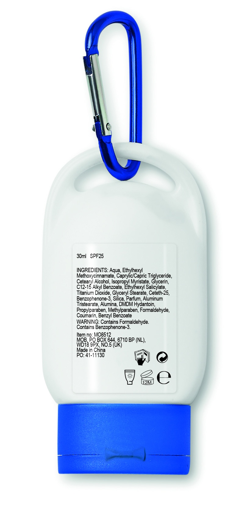 Solskyddsmedel med SPF25. Praktisk liten solkrämsbehållare med karbinhake. Behållaren innehåller 30ml solkräm.