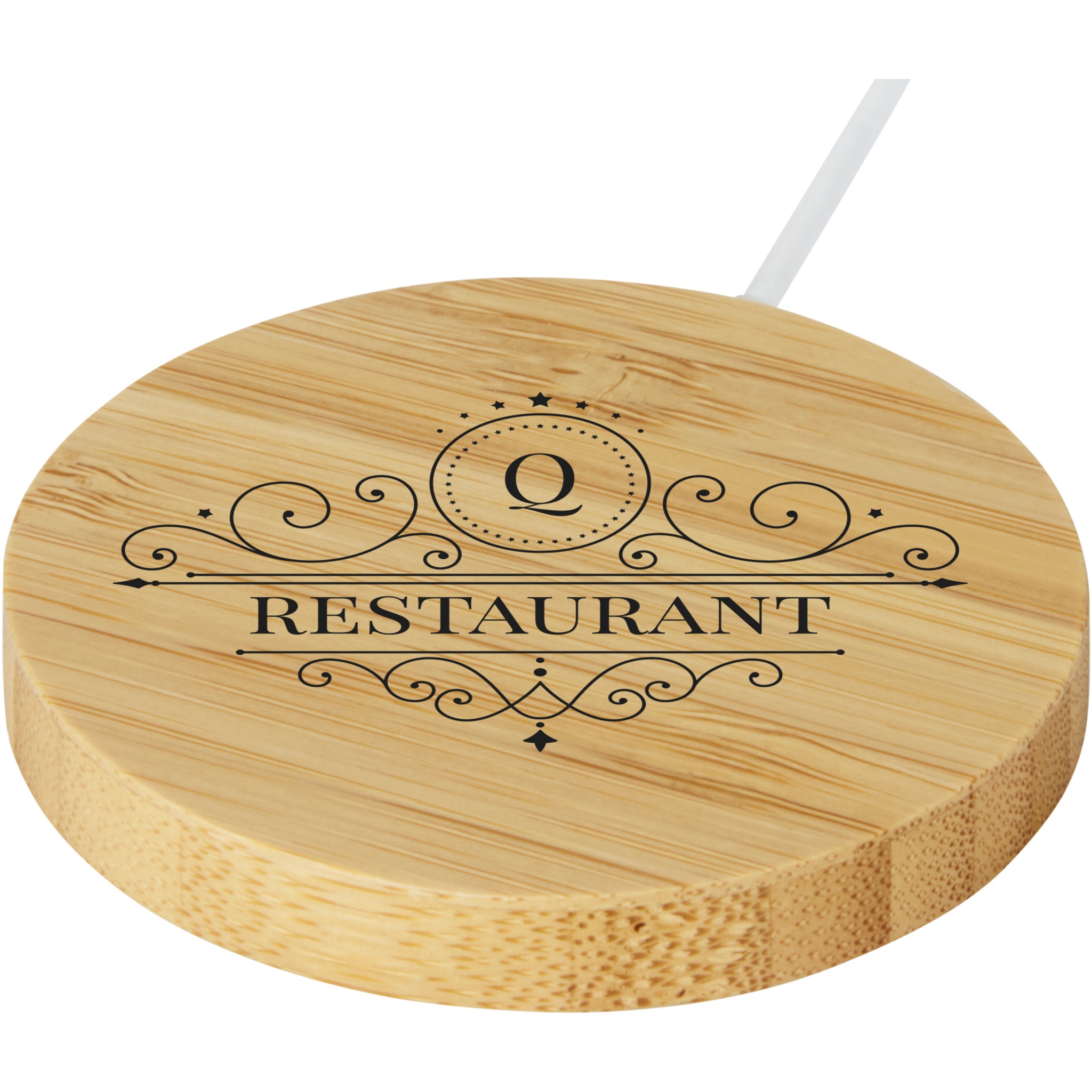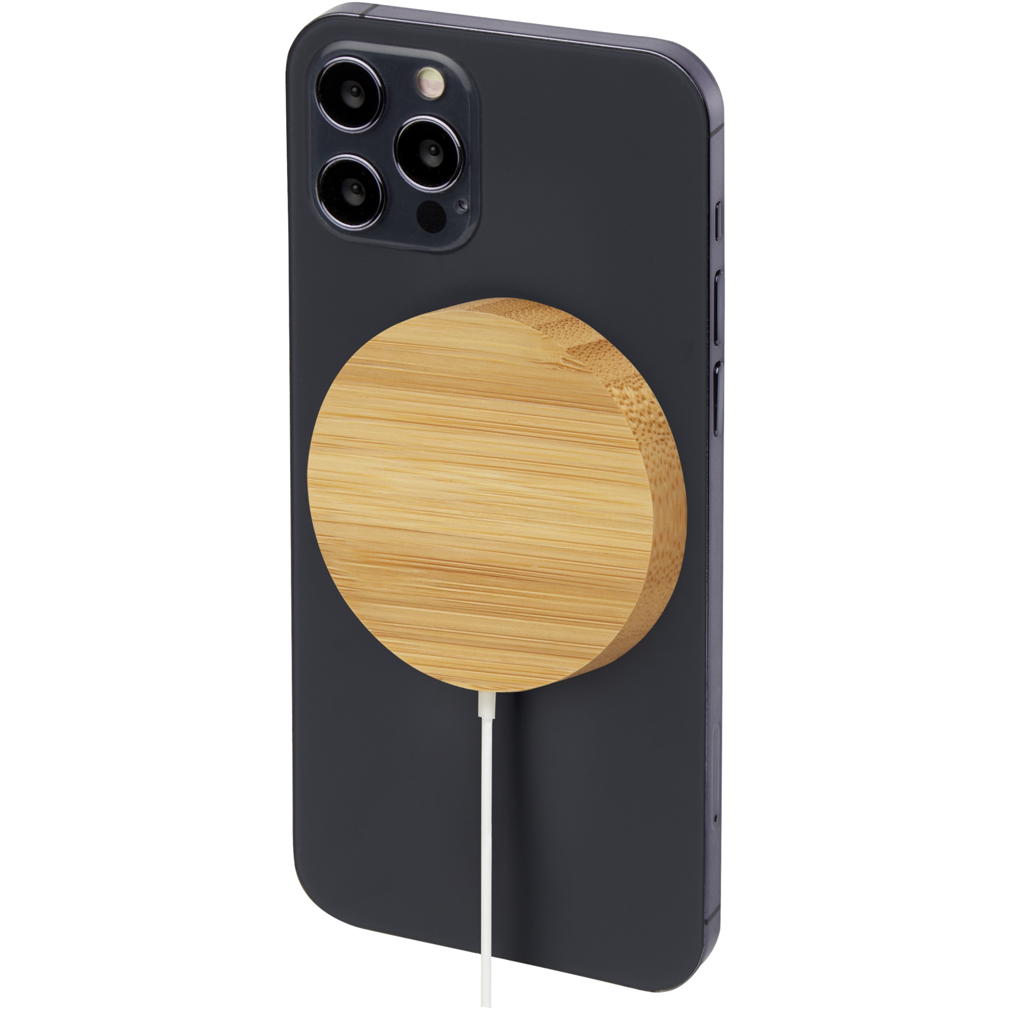 Trådlös magnetisk laddningsplatta i bambu som kan fästas på telefonens baksida (iPhone 12/iPhone 12 Pro/iPhone 12 Pro MAX) för att ladda enheten. 10 W trådlös laddare är kompatibel med alla Qi-enheter (iPhone 8 eller senare och Android-enheter som stöder trådlös laddning) och för andra telefoner kan den användas som en vanlig trådlös laddningsplatta. Levereras med en extra metallring med dubbelhäftande tejp för att göra artikeln kompatibel med alla andra smarttelefoner som har trådlös laddning. Levereras i en presentförpackning inklusive bruksanvisningen (båda tillverkade av hållbara material).