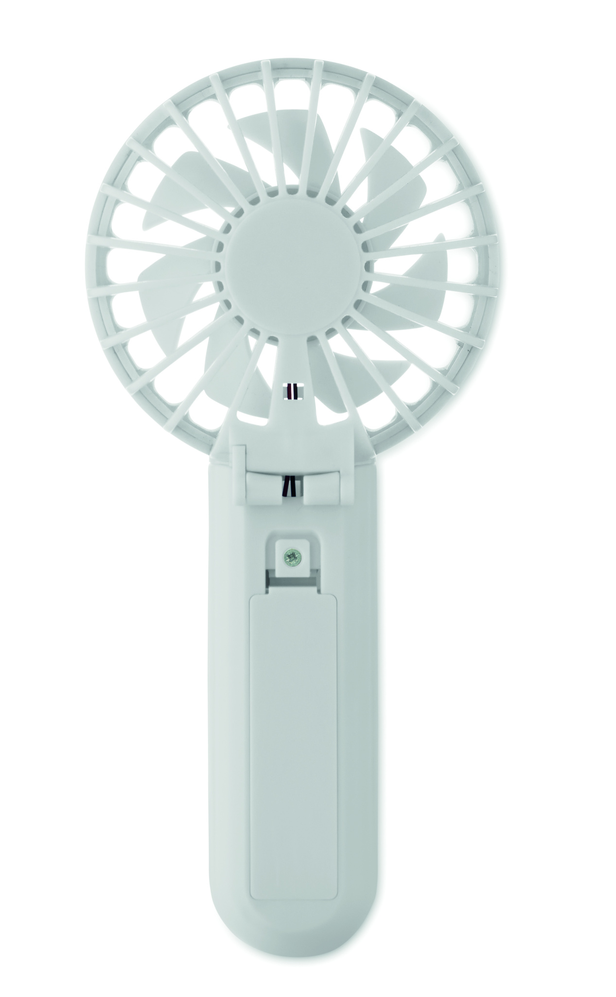 Bärbar, hopfällbar fläkt i ABS med 3 hastighetsinställningar. Kan användas som handhållen fläkt eller bordsfläkt. Inklusive 1 utbytbart och uppladdningsbart 14500 litiumbatteri på 500 mAh.