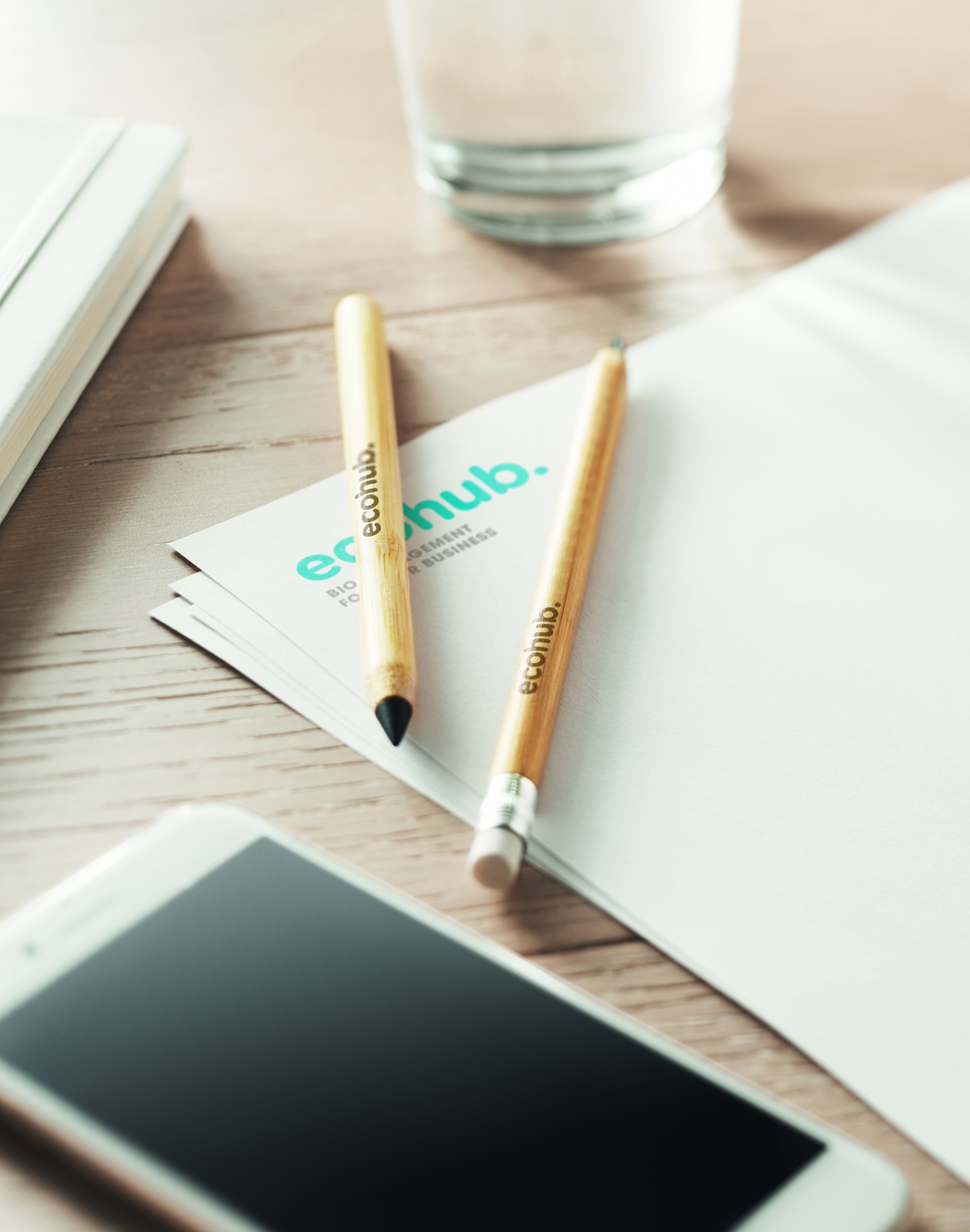 Långvarig bläckfri "evighetspenna" i bambu med papperslock. Pennan skriver med grafitspetsen. Detta gör denna penna till ett utmärkt hållbart alternativ till den traditionella pennan. Bambu är en naturlig produkt, det kan finnas små variationer i färg och storlek per föremål, vilket kan påverka det slutliga dekorationsresultatet.