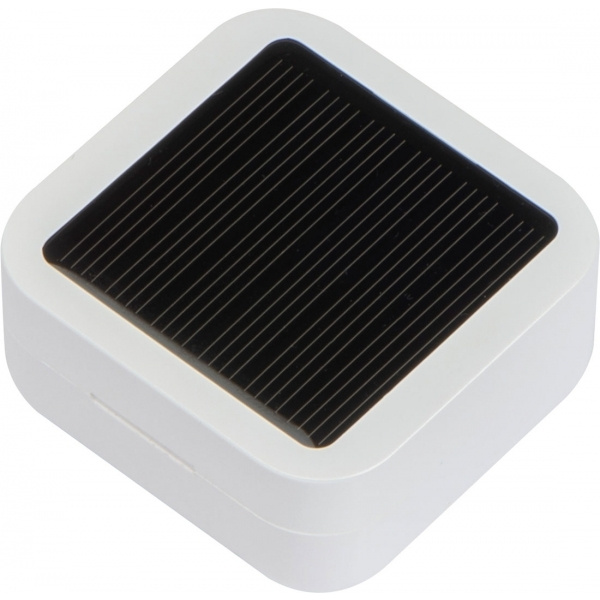 In-ear Bluetooth-hörlurar med laddningsindikator och laddningsstation. Denna kan laddas antingen via solfältet i locket eller via laddkabeln (medföljer). Batteri: 35mAh, drifttid: 2-3 timmar, laddningstid med kabel: ca. 1 timme, laddningstid med solfält: ca. 4 timmar. Din logotyp kommer att placeras på botten av lådan.