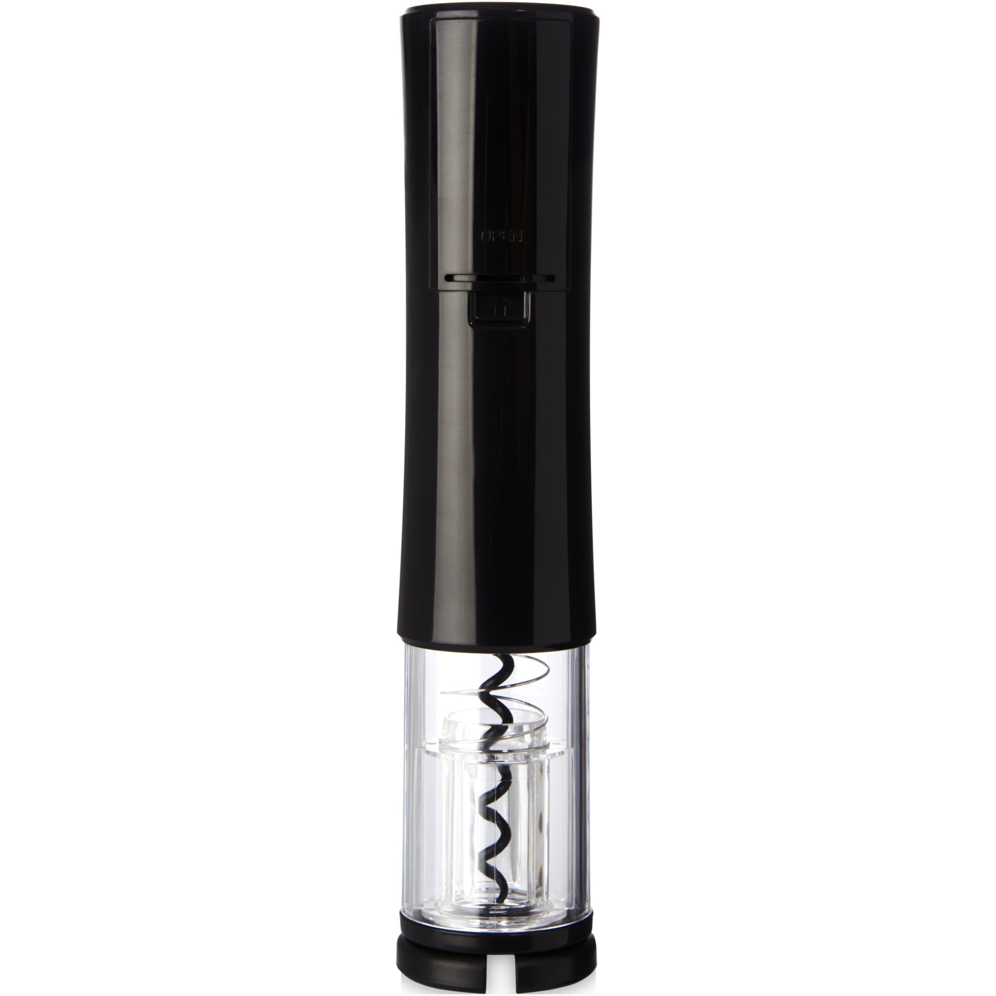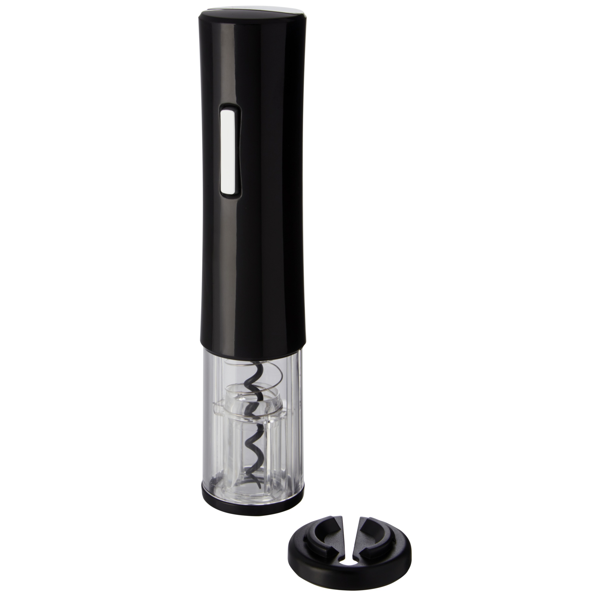 Elektrisk vinöppnare som har en folieskärare. Den använder 4 AA-batterier (ingår ej).