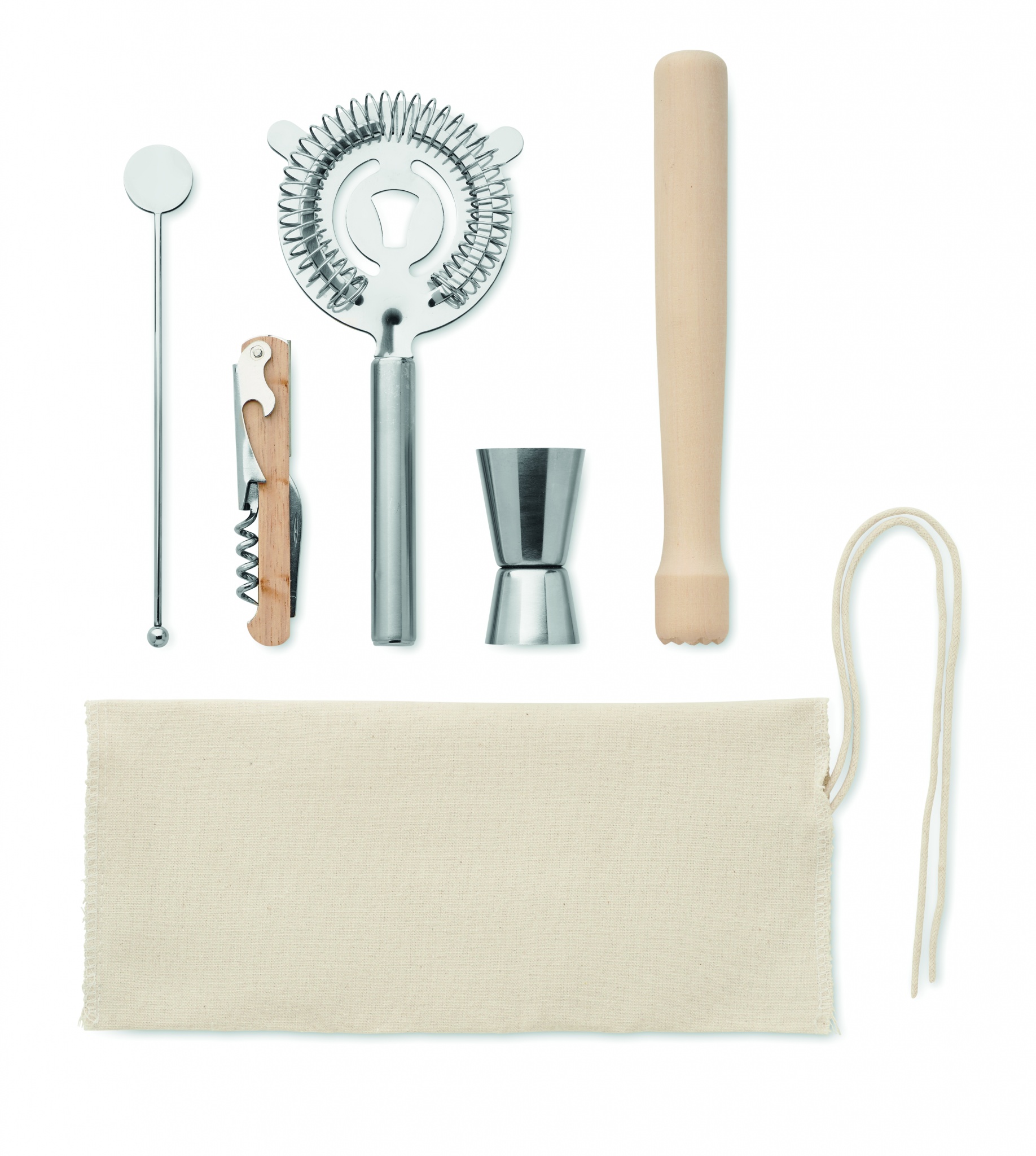 Cocktailkit i bomullspåse med snöre. Innehåller 5 delar: en dubbelsidig drinkmått (15 & 30 ml), muddler i trä, cocktailsil, drinkomrörare och servitörsvinöppnare.