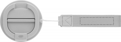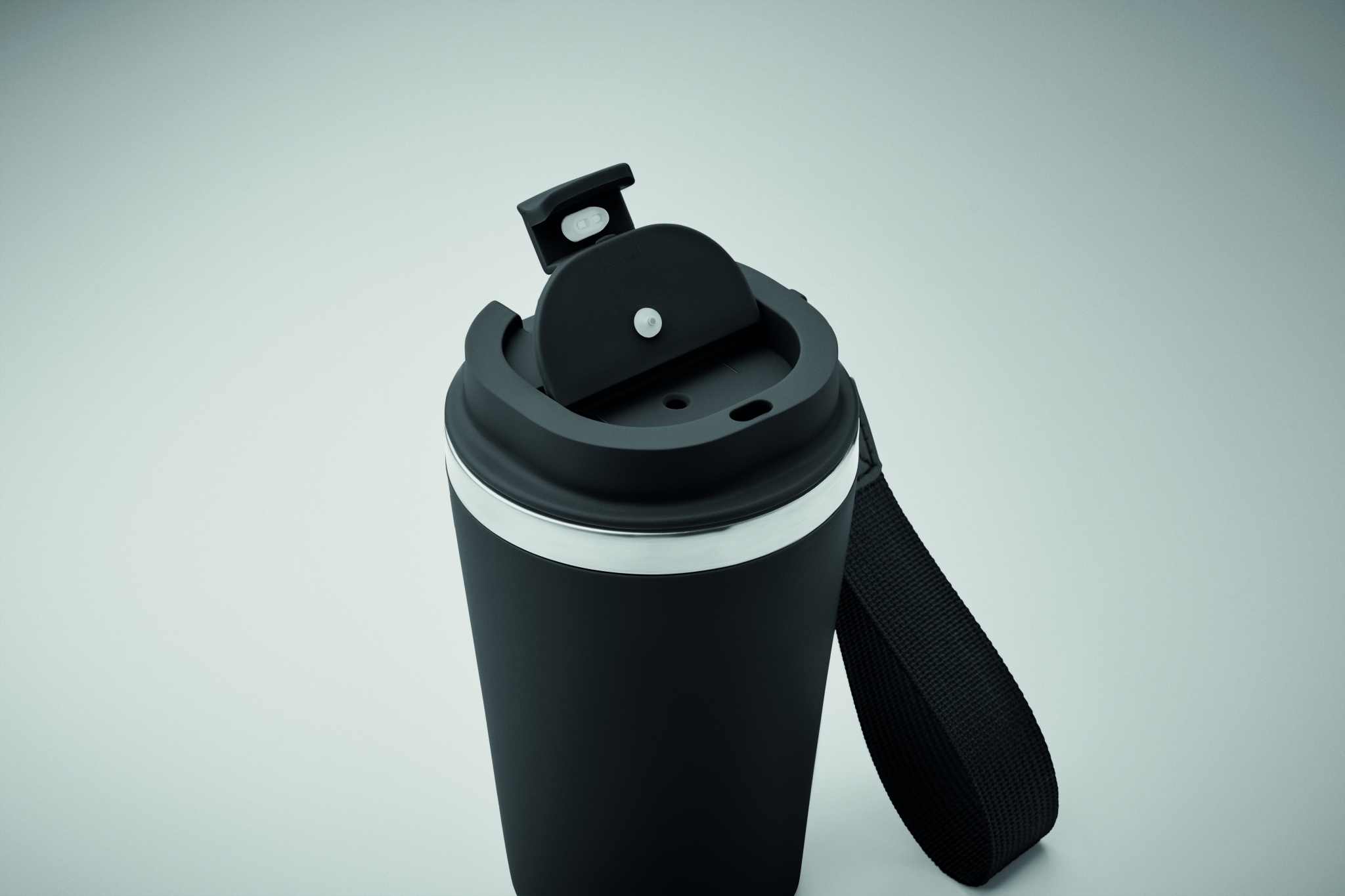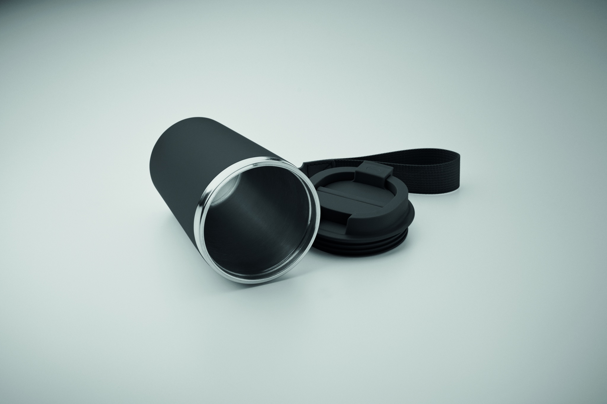 Mugg med dubbelvägg i återvunnet rostfritt stål (90 % återvunnet rostfritt stål och 10 % rostfritt stål) med återvunnet PP-utsida och RPET-handledsrem. Läckagefri. Volym: 350 ml.