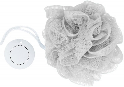 Dusch puff. Mjuk och skön ''tvättsvamp'' med en tryckbar etikett.
