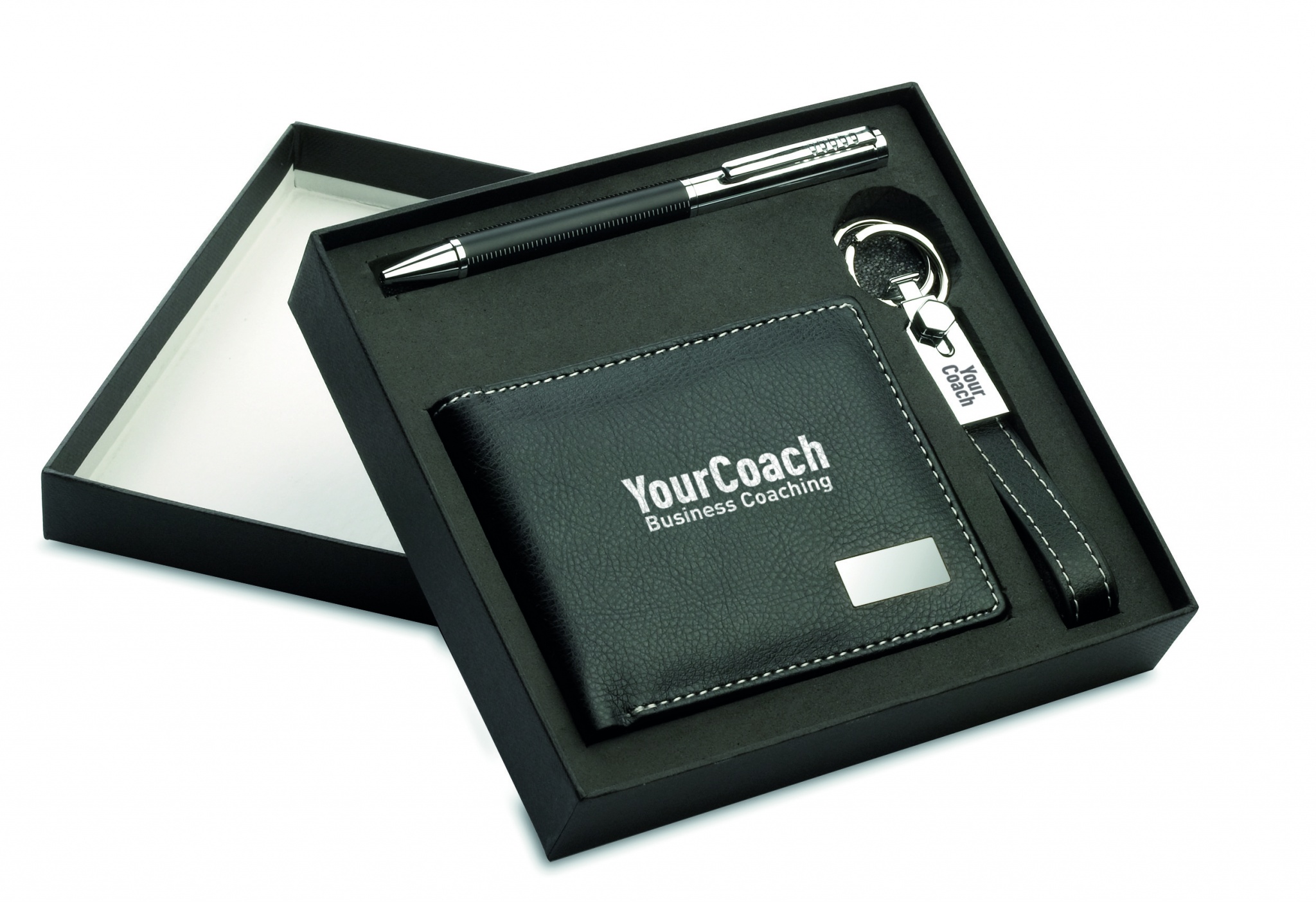 Elegant presentset i en EVA förpackning. Med en vridbar kulpenna med refill i blått bläck, metall nyckelring med PU ögla och PU plånbok med kontrast sömmar.