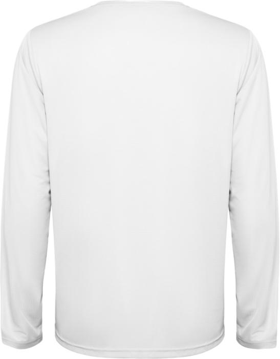Unisex teknisk T-shirt med långa ärmar. Krage med matchande sömmar. Bakre fållen något längre än den främre. Sidosömmarna har flyttats framåt.
