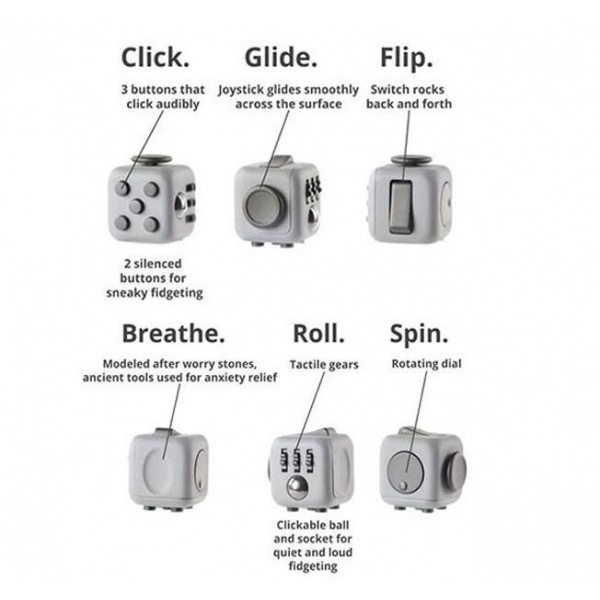 Fidget Cube är en skrivbordsleksak för alla som gillar att fiffla. Den har sex sidor. Varje sida har något att röra på: klicka, glida, vända, andas, rulla, snurra. Fidget Cube finns i 10 olika färgscheman: svart, gul, rosa, grön, blå, grå.