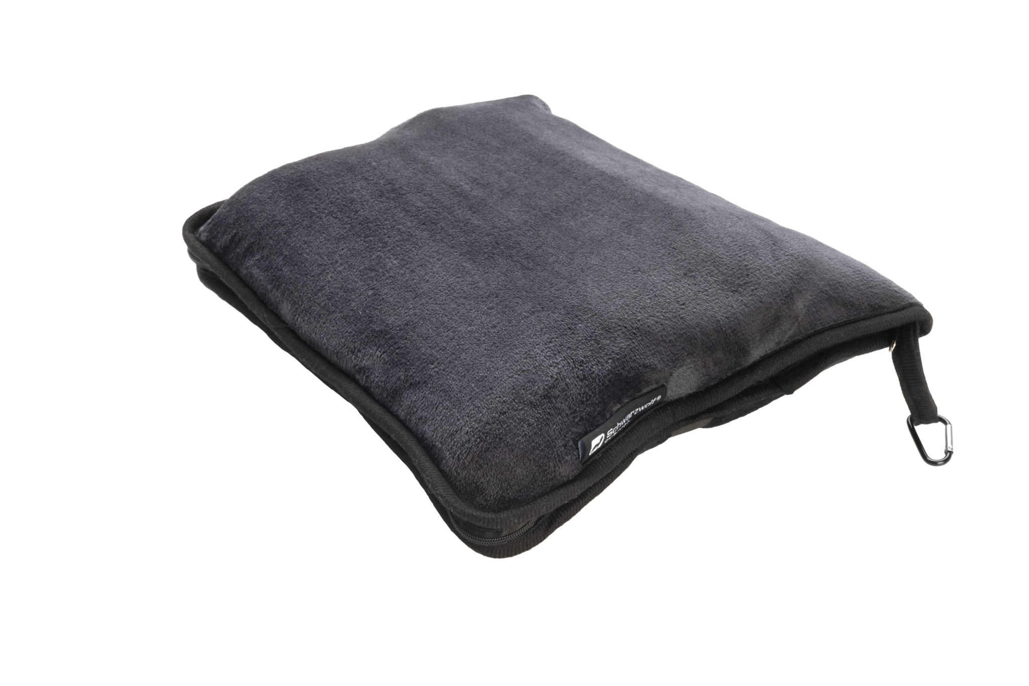 Schwarzwolf 2in1 resefilt i fleece som kan användas som filt eller vikas till ett överdrag av samma material och förvandlat det till en bekväm kudde. Filten är gjord i mörkgrå och kan användas under dina resor eller packas som sällskap under camping. Överdraget till den vikta filten innehåller en karbinhake för att fästa på ditt bagage.