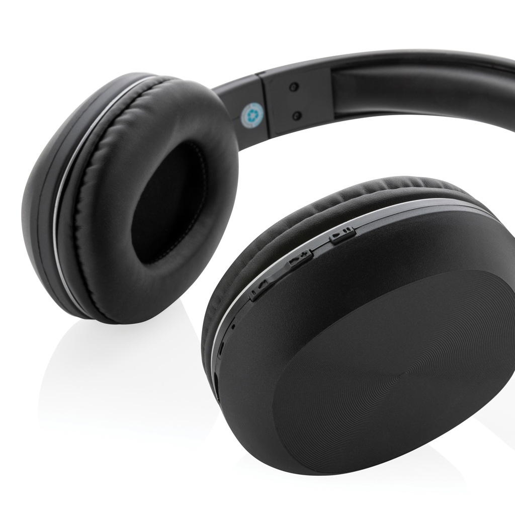 Bekväma trådlösa hörlurar med BT 5.1 för smidig anslutning och lång speltid. Tillverkad av RCS (Recycled Claim Standard) certifierad återvunnen ABS. Totalt återvunnet innehåll: 73% baserat på total produktvikt. RCS certifiering säkerställer en helt certifierad leveranskedja av de återvunna materialen. Over ear-designen ger en grym ljudupplevelse. Det inbyggda batteriet på 200 mAh ger en speltid på upp till 5 timmar och kan laddas upp på 1,5 timme. Räckvidd upp till 10 meter. Med mikrofon för att besvara samtal. Laddningskabel i GRS certifierad TPE medföljer. Levereras i FSC mix kraft förpackning. Produkt och accessoarer är 100% PVC-fria.