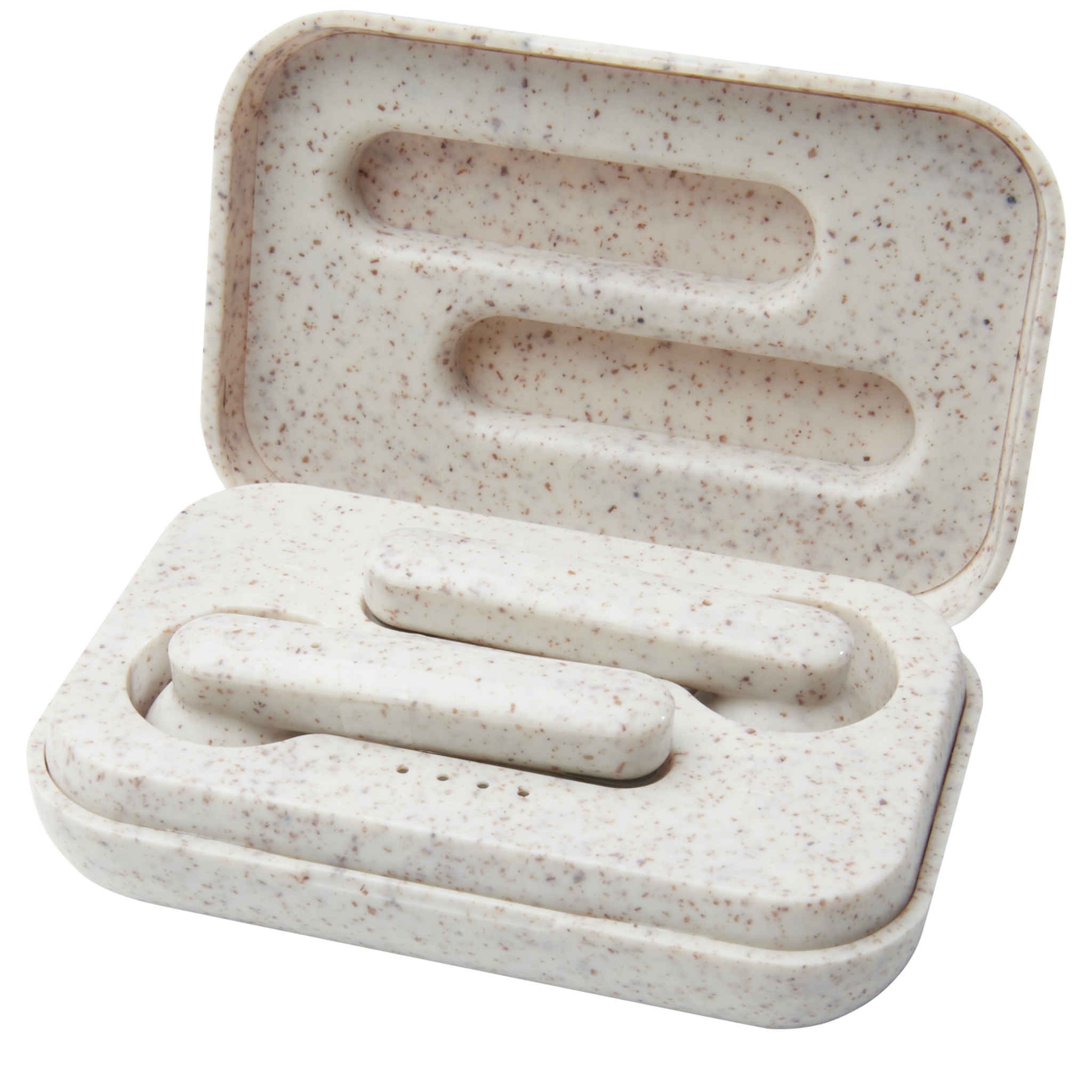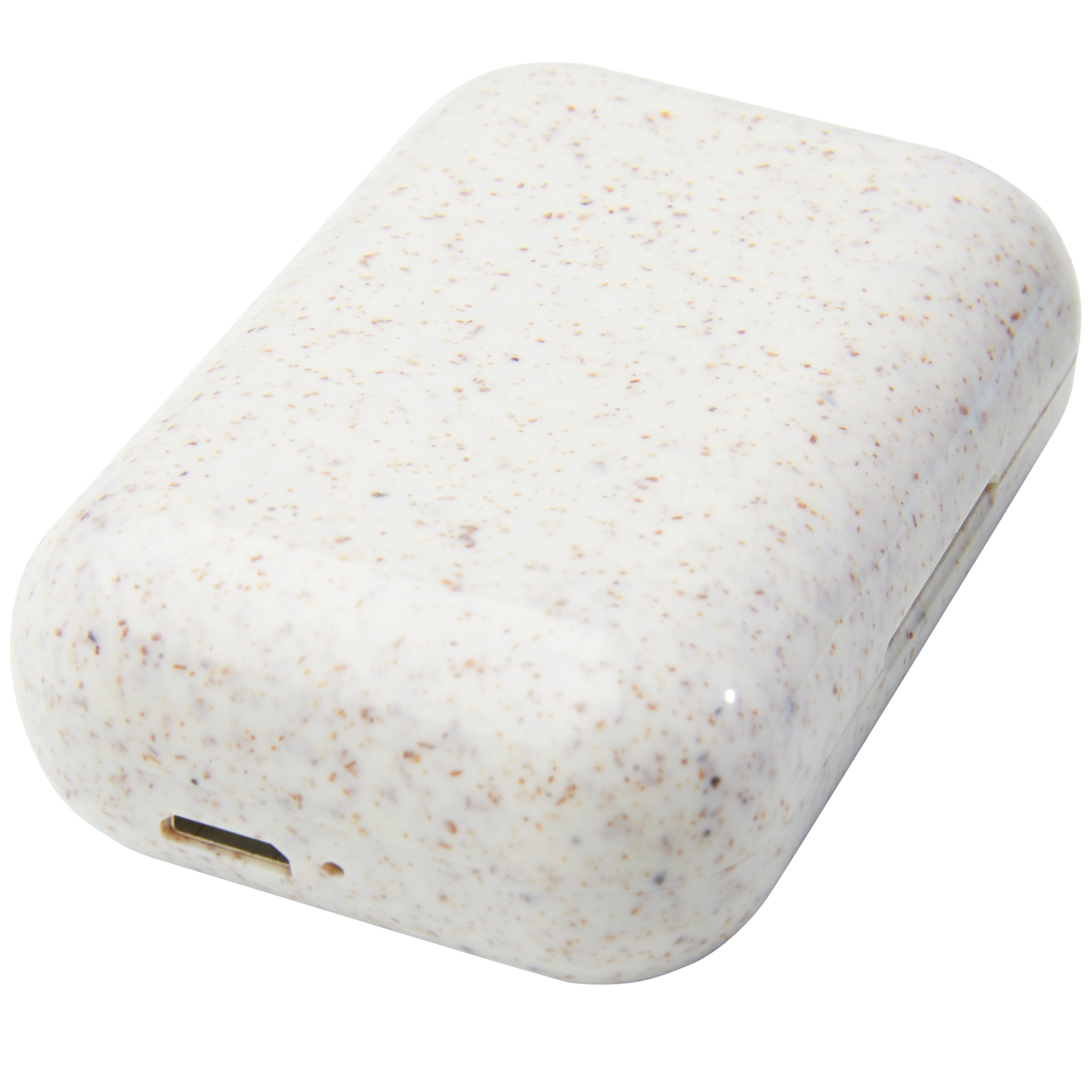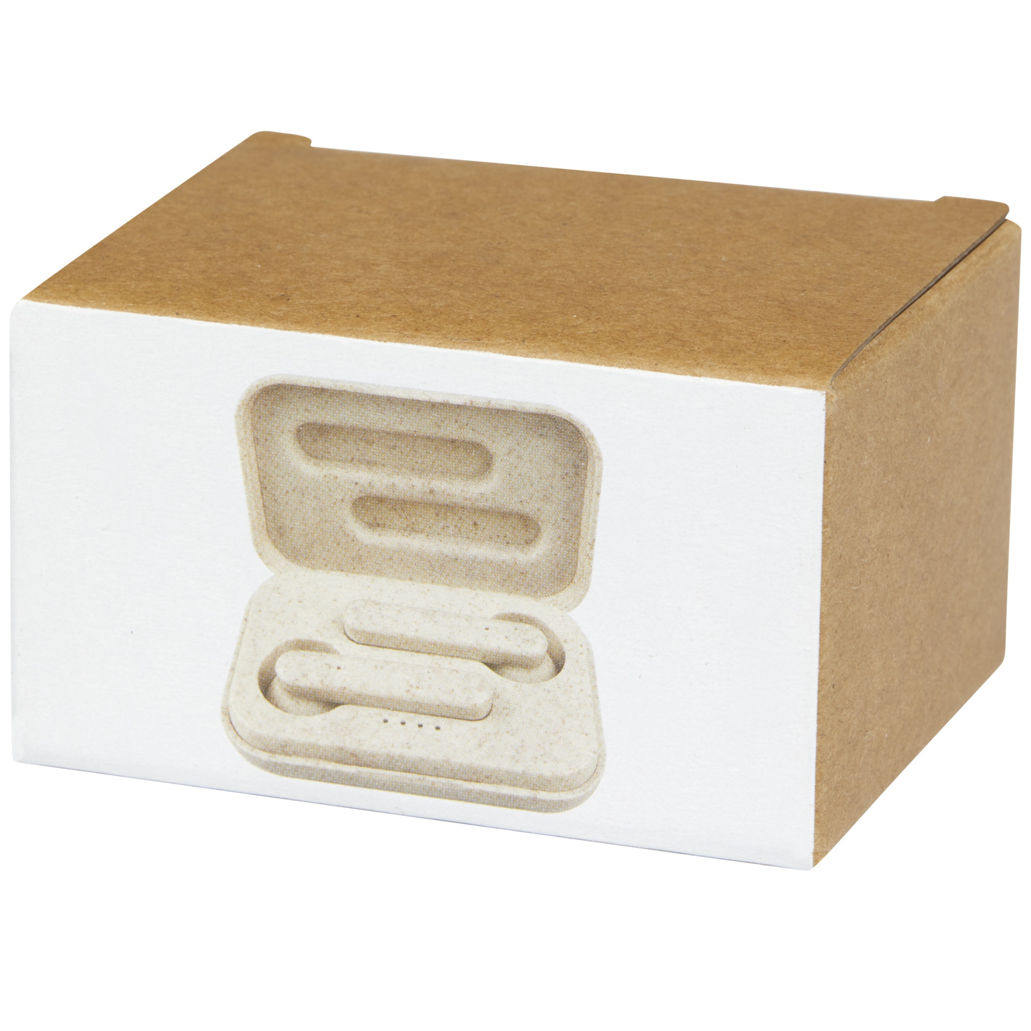 True Wireless stereoöronsnäckor gjorda av en plastblandning med halm, vilket minskar mängden plast som behövs. Multifunktionsknapp för att styra alla funktioner: På/av, svara/lägga på, spela, pausa, nästa/föregående spår, volym upp/ner och aktivera röstassistent. Bluetooth® 5.0 med räckvidd upp till 10 meter. Laddningsfodralet kan ladda öronsnäckorna från 0 till 100 % minst 3 gånger. Uppspelningstiden är upp till 2 timmar vid maxvolym och öronsnäckorna kan laddas helt på 1 timme. Levereras i en presentförpackning inklusive bruksanvisningen (båda tillverkade av hållbara material).