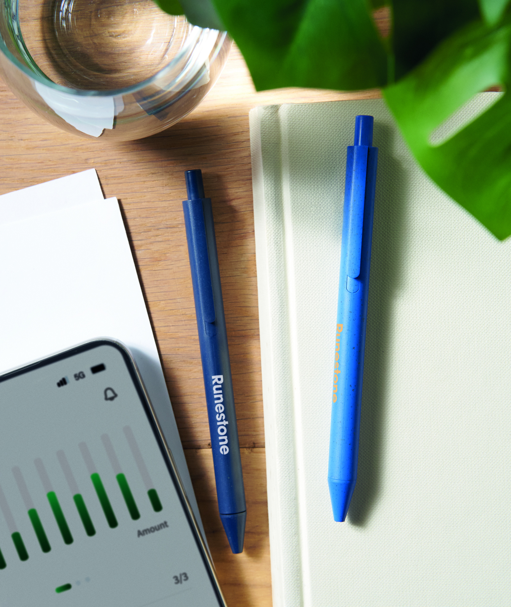 Penna i miljövänligare material. Vete-halm 50% och PP plast 50% (blått bläck).