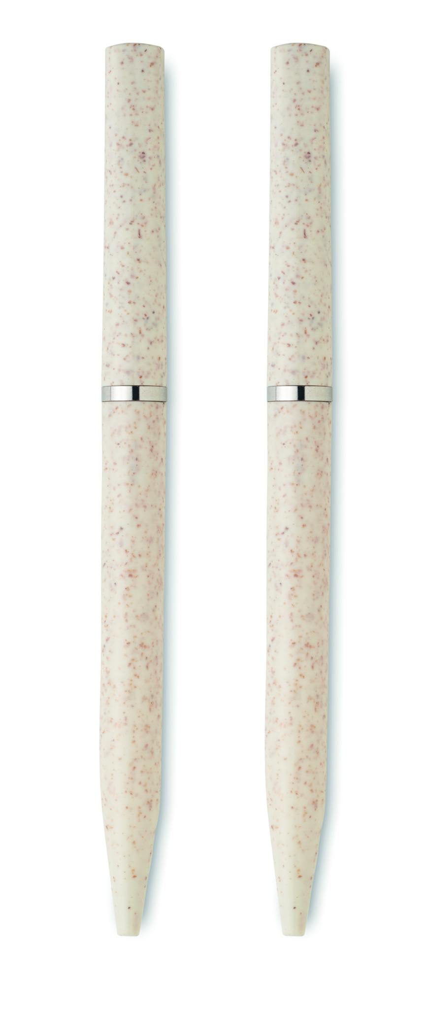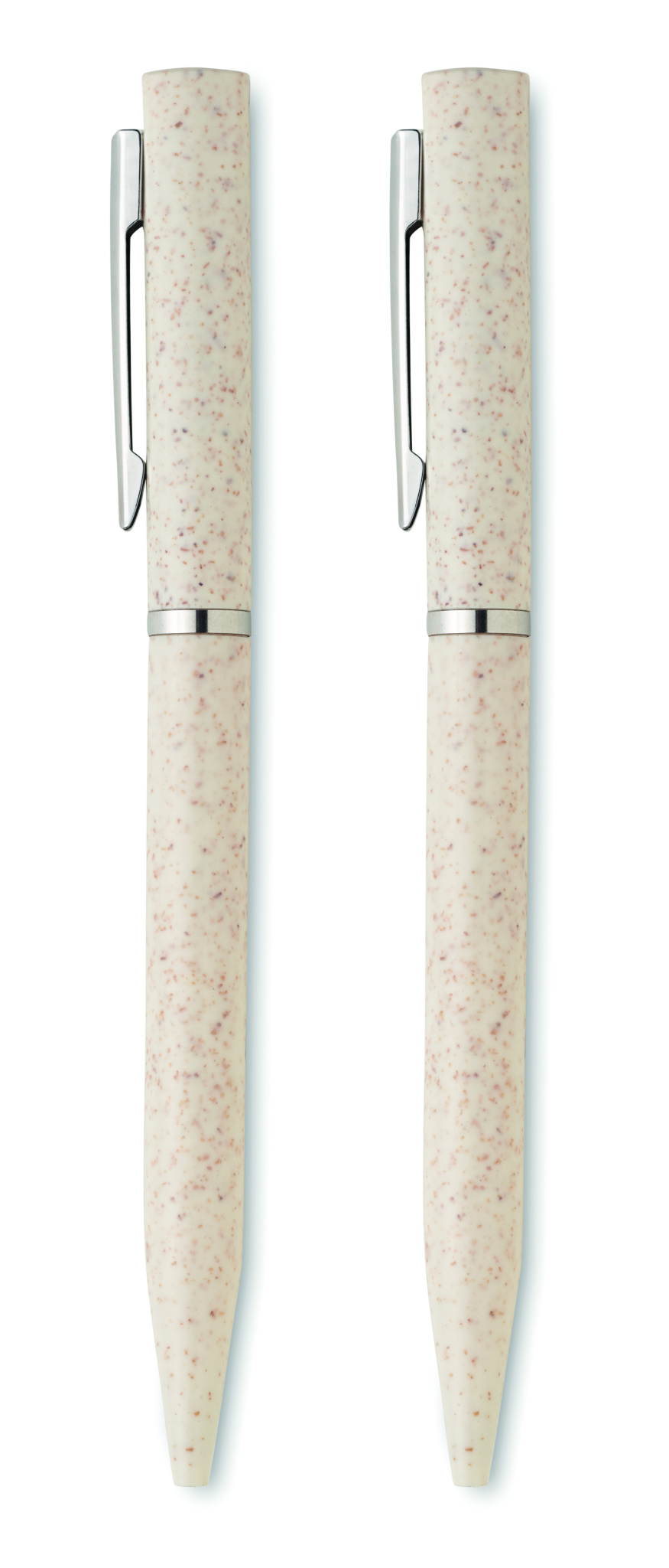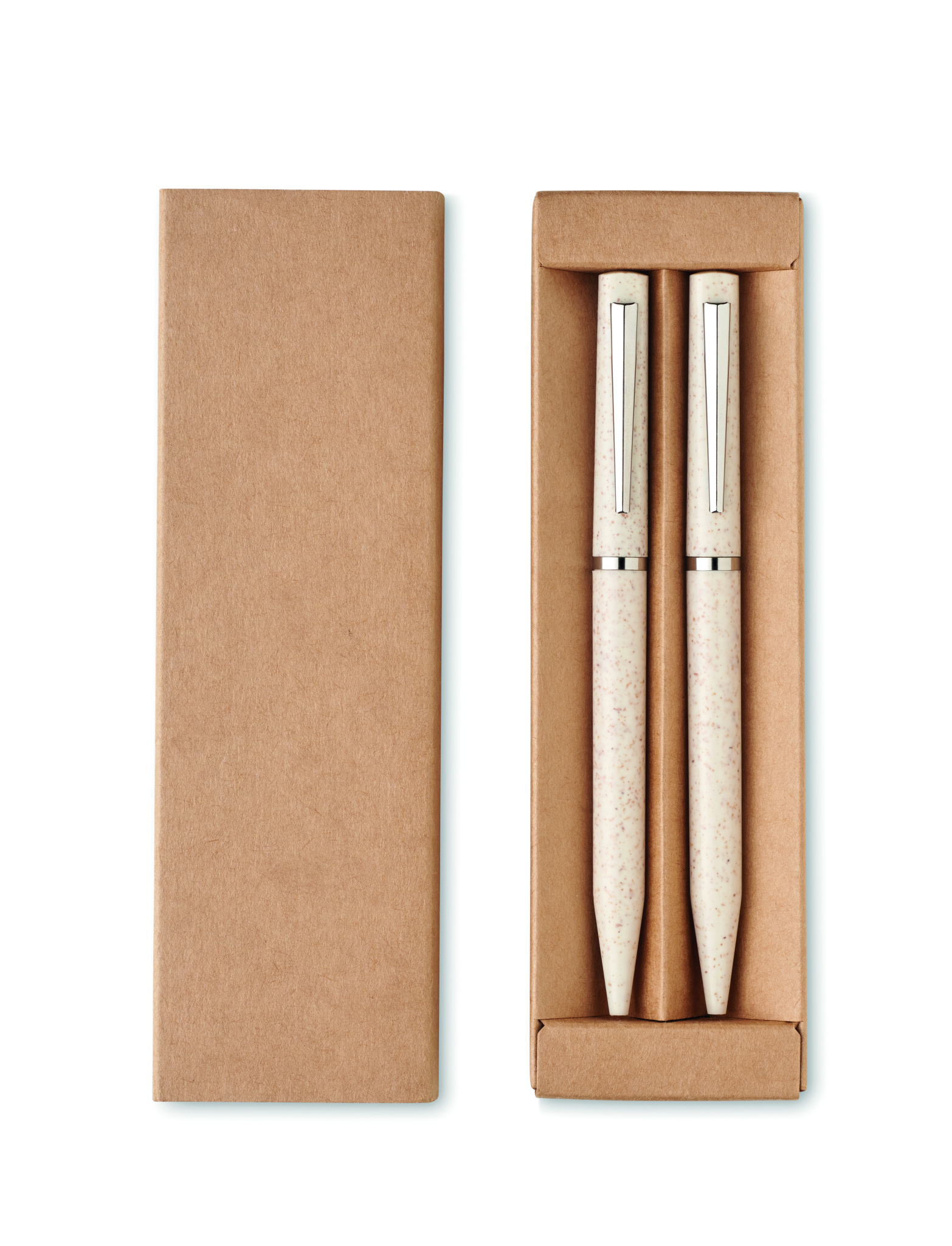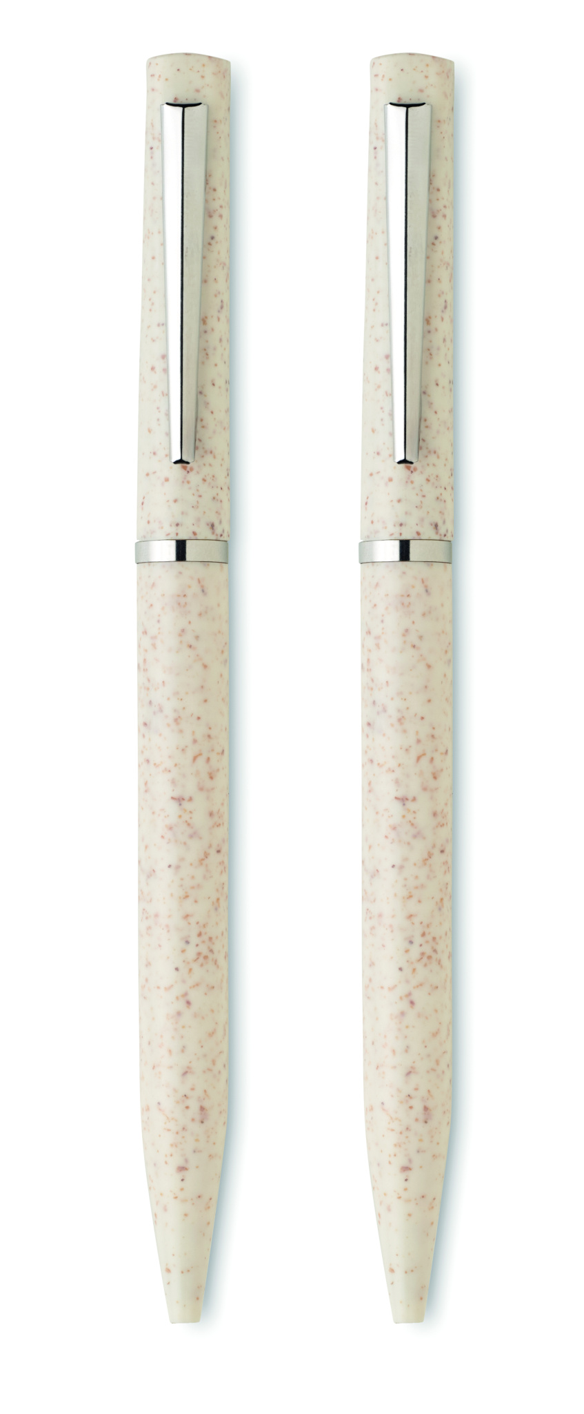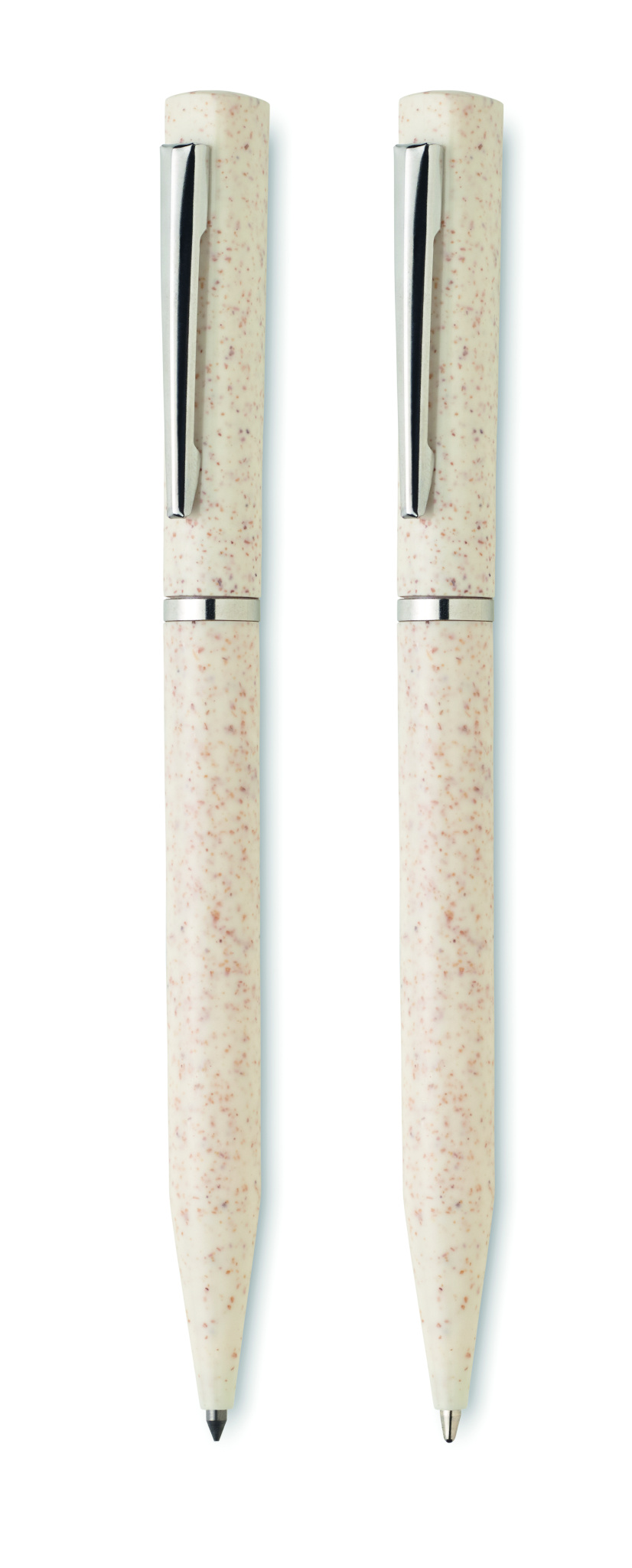 Pennset av vetehalm/ABS med 1 vridbar kulspetspenna med blått bläck och 1 vridbar grafitkulspetspenna bläckfri. Levereras i en låda av återvunnet papper.
