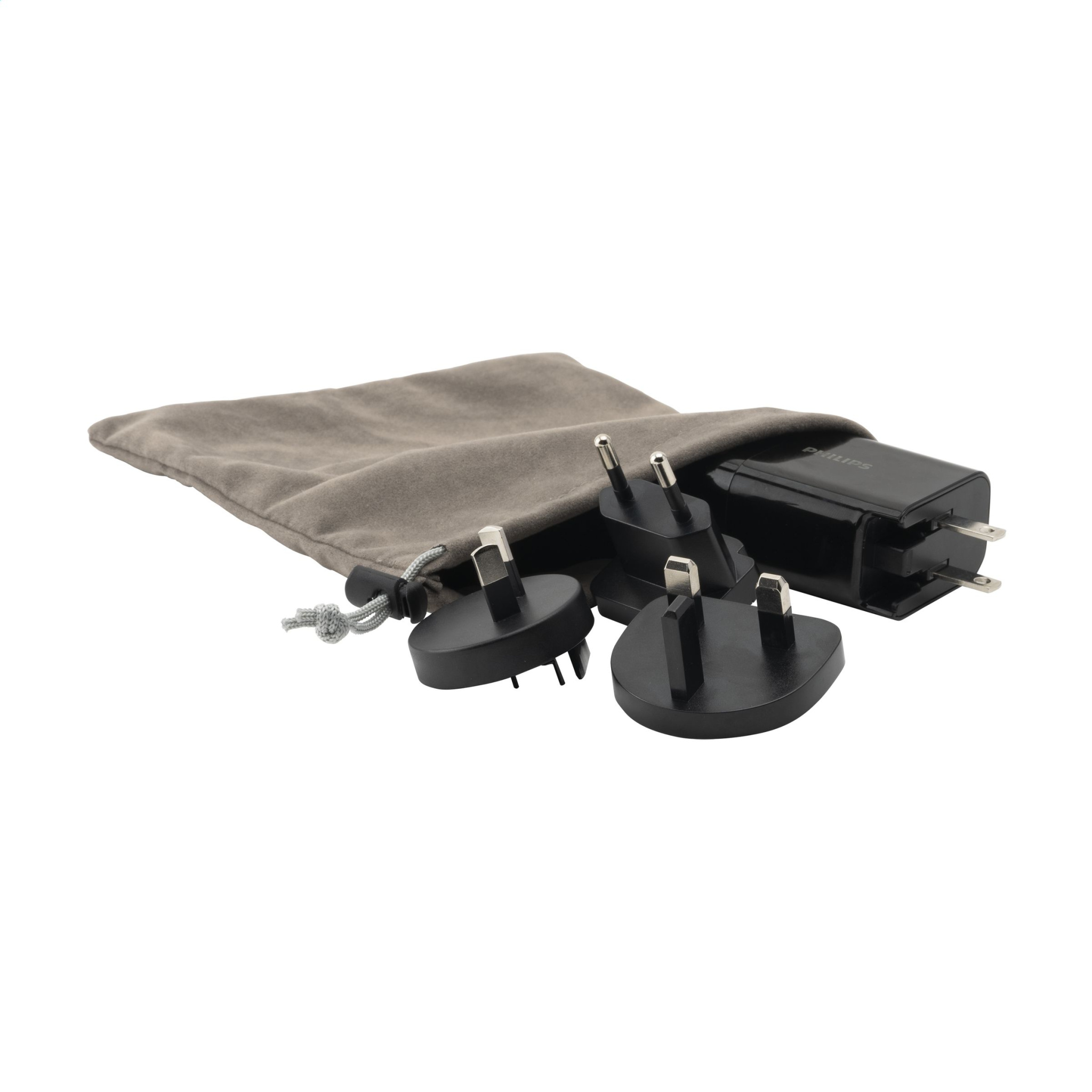 Idealisk för resor, med fyra utbytbara pluggar och en praktisk resepåse. Ladda dina enheter blixtsnabbt med den kraftfulla USB-C-porten med PD-stöd. Använd USB-A-porten för att ladda andra enheter samtidigt. Levereras med 4 pluggar: en integrerad amerikansk kontakt och en utbytbar AU-, UK- och EU-kontakt. Ingång: 100-240V, 50-60Hz 0,7A. Utgång: USB A 5V/2,4A. Typ-C 5V/3A, 9V/2A, 12V/1,5A. Varje artikel är individuellt förpackad.