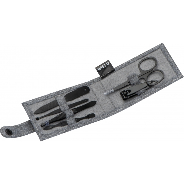 Attraktivt manikyrset av filt (återvunnen PET). Den innehåller en nagelsax, en nagelfil, nagelklippare, pincett och två nagelbandsskjutare. Vi placerar din logotyp på framsidan av fodralet.